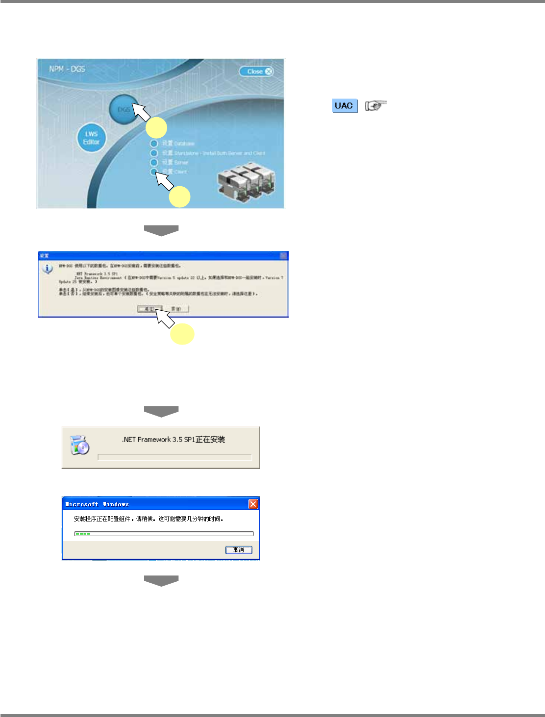 NPM-DGS 程序手册 2.1 NPM-DGS 的安装 EJS9AC-MB-02P-03 Page 2-33 ② 安装 DGS 客户端时 在与安装有 SQL Server 2008 的 PC 或安装有服务器的 PC 不同的 PC 上,安装 DGS 客户端。 1 在放入 CD-ROM 后自动再生的画面上 选择 ‘DGS’ 的 ‘ 设置 Client’ 。 ( ‘1.3.1 关于用户帐户控制 ’) 2 在设置确认对话框上点击 [ 是 …