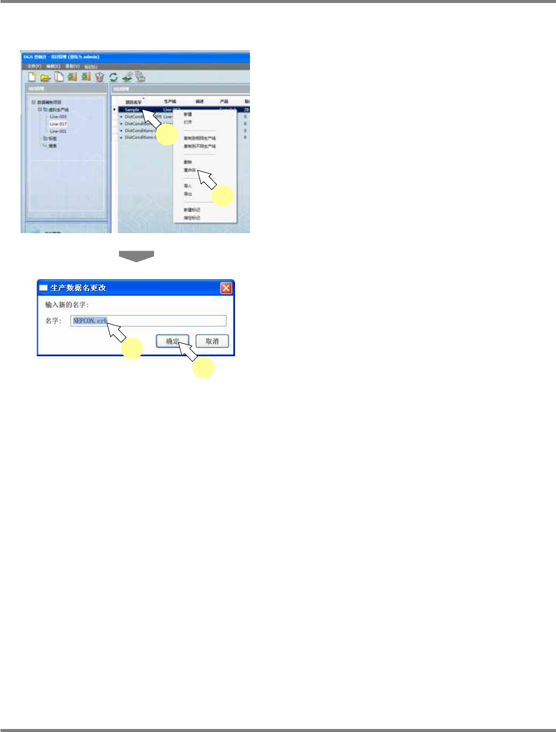 NPM-DGS 程序手册 7.1 概要 EJS9AC-MB-07P-09 Page 7-17 数据编制工作的删除 1 在数据编制工作一览表中选择要删除 的数据编制工作。 2 选择菜单栏的 [ 编辑 ] [ 删除 ] ,或者点 击工具栏的 ( 删除 ) ,或者在选择 的数据编制工作的右击菜单中选择 [ 删 除 ] 。 显示出确认画面。 3 点击 [Yes] 。 在数据编制工作一览表中删除选择的 数据编制 工作。 Produ…