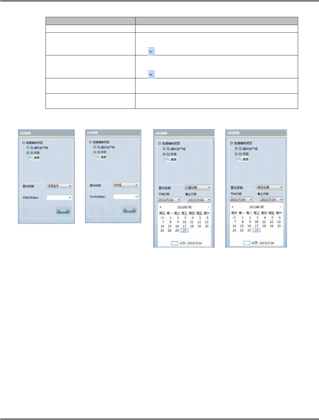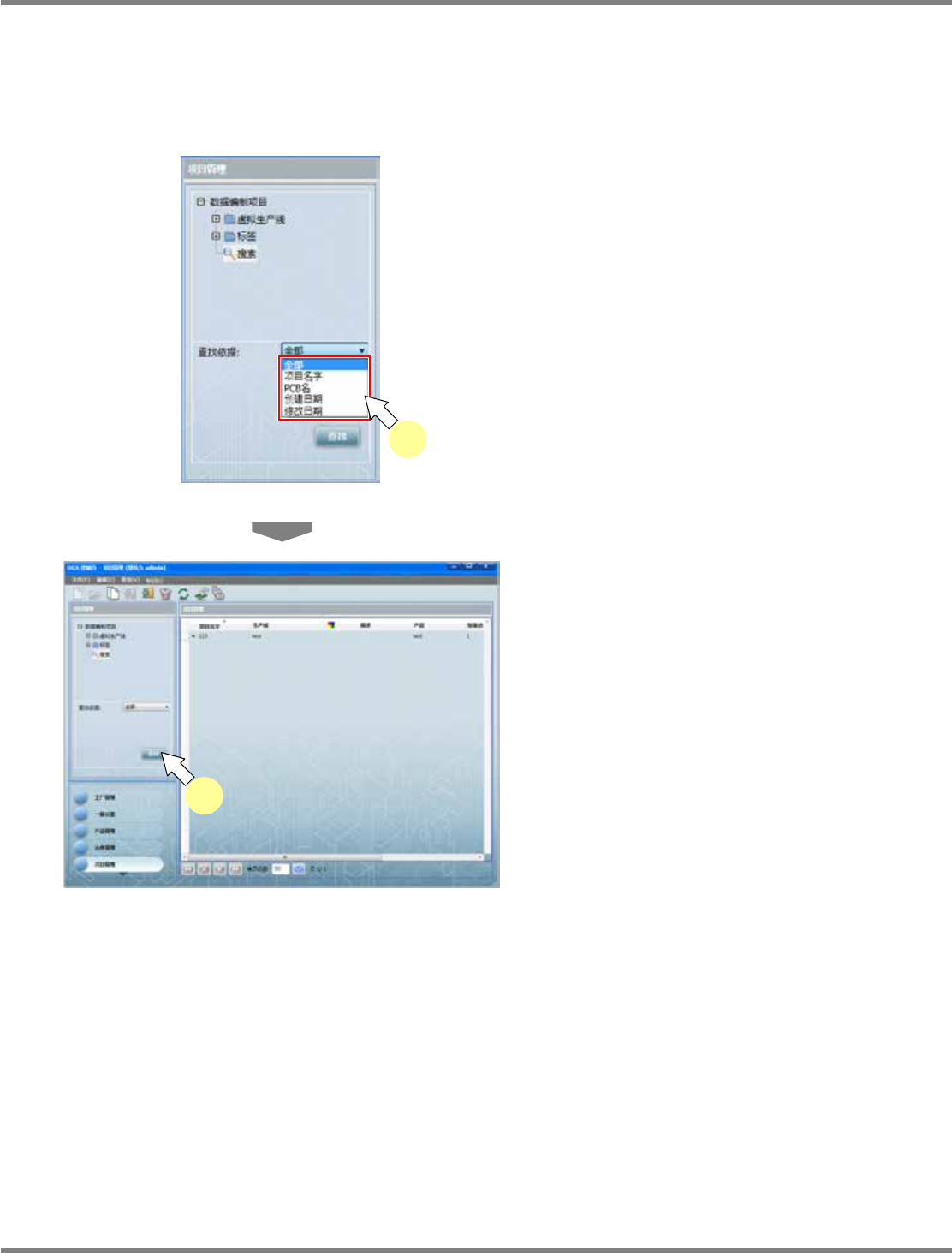 NPM-DGS 程序手册 7.1 概要 Page 7-24 EJS9AC-MB-07P-09 搜索方法 项目 说明 [ 全部 ] 显示所有被登录的数据编制工作。 [ 项目名字 ] 输入数据编制工作名的部分字符。显 示数据编制工作名中包含所 输入的字符的数据编制工作。 点击 ,即能够从搜索履历执行输入。 [ 产品名字 ] 输入使用中的 PCB 名的部分字符。 显示 PCB 名中包含所输入的 字符的数据编制工作。 点击 ,即能够从搜索履…