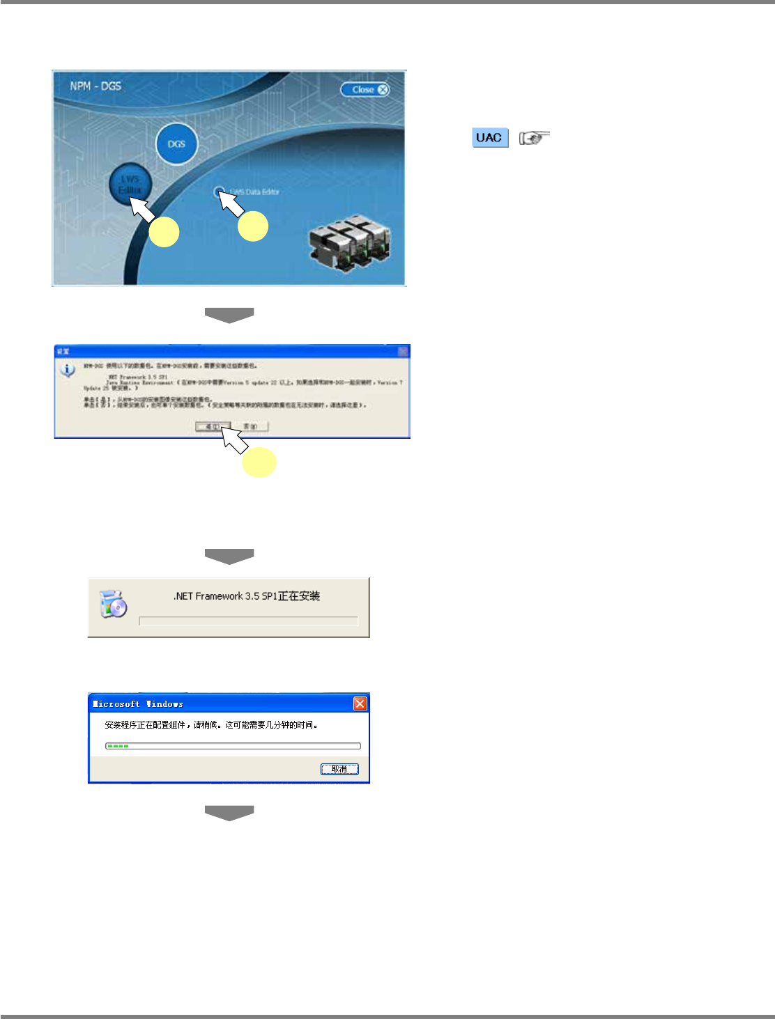NPM-DGS 程序手册 2.1 NPM-DGS 的安装 EJS9AC-MB-02P-03 Page 2-37 ③ LWS 数据编辑器的安装 在 PC 上安装 LWS 数据编辑器时的设定。 1 在放入 CD-ROM 后自动再生的画面上 选择 ‘LWS Editor’ 的 ‘LWS Data Editor’ 。 ( ‘1.3.1 关于用户帐户控制 ’) 2 在设置确认对话框上点击 [ 是 ] 。 当 .NET 与 JRE 为以下版…