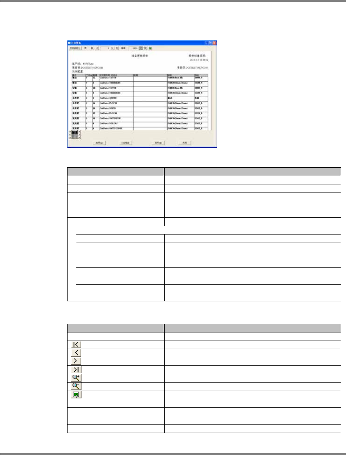 NPM-DGS 程序手册 7.2 项目编辑系统主画面 Page 7-56 EJS9AC-MB-07P-09 吸嘴配置信息 从料架配置信息向后翻页,即会显示 吸嘴配置信息。 显示项目 项目 说明 ‘ 页 ’ 显示页号。 ‘ 倍率 ’ 显示打印预览的显示倍率。 ‘ 报告创建日期 ’ 显示创建准备替换报告的日期时刻。 ‘ 生产线 ’ 显示生产线名称。 ‘ 准备前 ’ 显示准备前的生产数据名与批量名。 ‘ 准备后 ’ 显示准备后的生产数…
