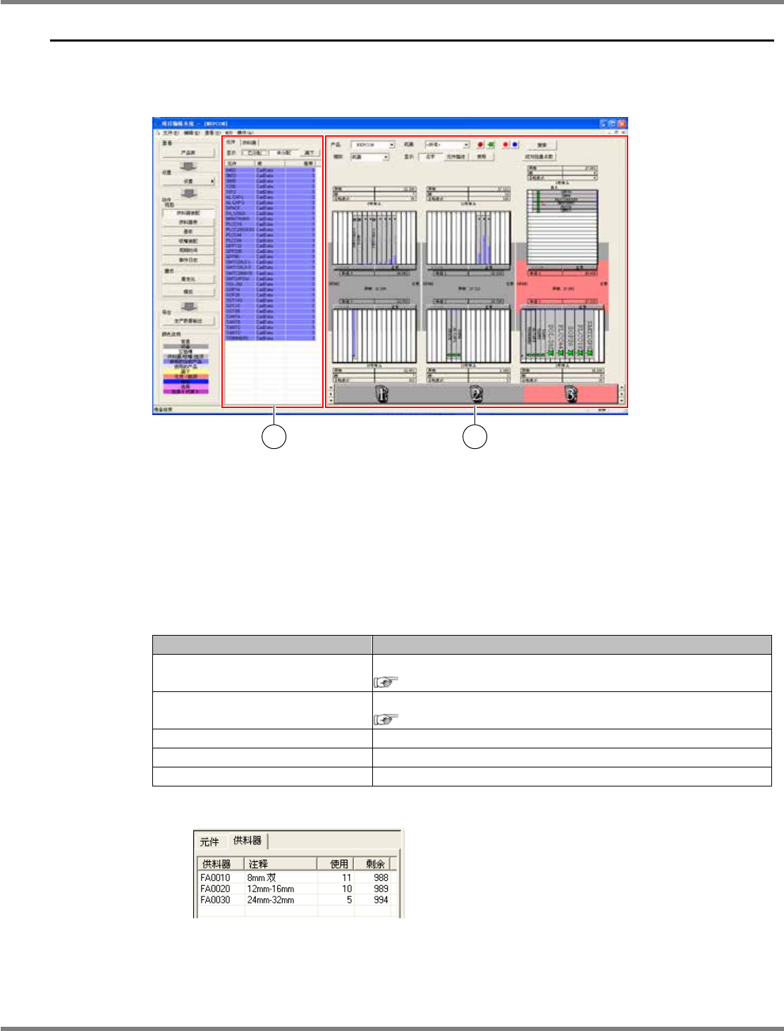 NPM-DGS 程序手册 7.4 供料器装配画面 EJS9AC-MB-07P-09 Page 7-77 7.4 供料器装配画面 通过供料器装配画面进行元件装配状 态的确认和更改。请在项目栏的 ‘ 动作 ’ 的 ‘ 视图 ’ 中选择 [ 供料器 装配 ] 。供料器装配画面是项目编辑系统 的初期画面,优化完毕后也会自动切 换为此画面。 此时,除了元件装配以外,还可确认 循环时间、过程数、实装点总数 。 ① 元件列表、供料器列表 点击元件标签…