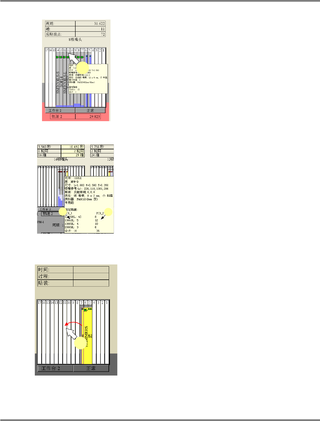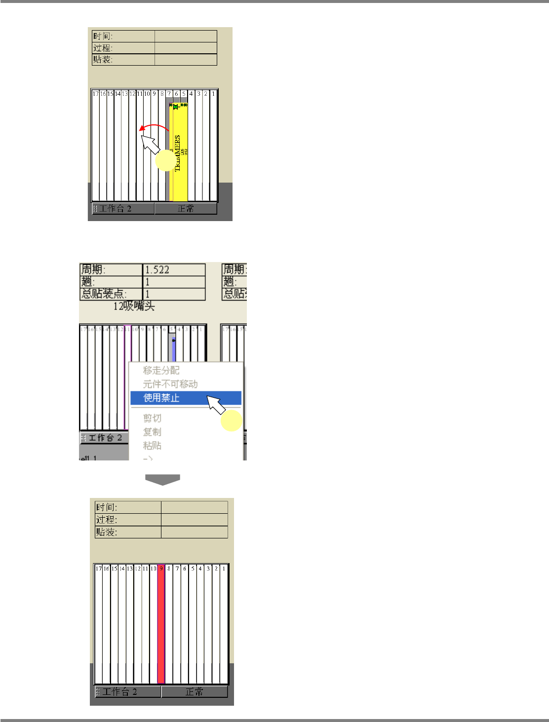NPM-DGS 程序手册 7.4 供料器装配画面 EJS9AC-MB-07P-09 Page 7-83 元件的拷贝 1 选择要拷贝的元件,边按 [Shift] ,边拖 放到拷贝地点的插槽上。 进行拖放时显示元件名。 设定禁止使用的插槽 1 右击进行禁止设定的插槽,选择 [ 使用 禁止 ] 。 所设定的插槽将会变成分配禁止状态 ,以粉红 色表示。 Product070300S- 11C00 Project070300S-1…