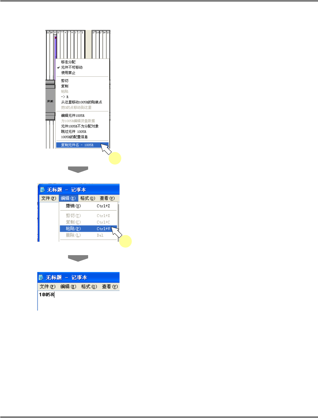 NPM-DGS 程序手册 7.4 供料器装配画面 Page 7-94 EJS9AC-MB-07P-09 复制元件名 1 在元件一览上右点击元件后,选择 [ 复 制元件名 ]; 或者在配置在供料器上的 元件上右点击后,选择 [ 复制元件名 ] 。 所选择的元件名将会被复制到剪贴板 上。 2 启动记事本等软件后,选择 [ 粘贴 ] 。 将会粘贴复制在剪贴板上的元件名。 Product070300S- 33C01 1 Produc…