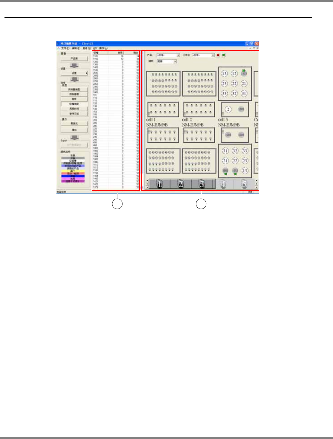 NPM-DGS 程序手册 7.5 吸嘴装配画面 Page 7-100 EJS9AC-MB-07P-09 7.5 吸嘴装配画面 通过吸嘴装配画面进行吸嘴装配状态 的确认和更改。 请在项目栏的 ‘ 动作 ’ 的 ‘ 视图 ’ 中选择 [ 吸嘴装配 ] 。 ① 吸嘴一览 显示吸嘴一览和其剩余数 ( 在仓库中所设定的数量 装配到吸嘴交换器的数量 ) 。 ② 吸嘴装配 显示吸嘴装配。也可进行吸嘴装配的 更改。 ‘ 缩放 ’ 更改吸嘴装配的…