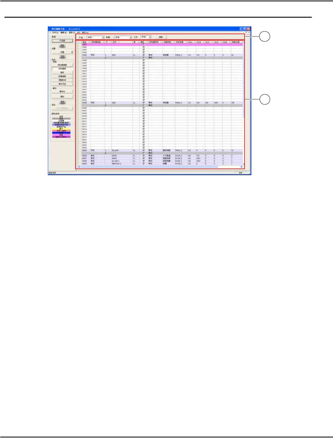 NPM-DGS 程序手册 7.6 供料器表画面 Page 7-104 EJS9AC-MB-07P-09 7.6 供料器表画面 ① 画面显示控制部 ‘ 产品 ’ 选择要显示的 PCB 。 ‘ 机器 ’ 按设备分别显示供料器。 ‘ 工作 ’ 按工作台分别显示供料器。 [ 搜索 ] 显示搜索画面。 Product070500S- 01C04 2 1 2 2