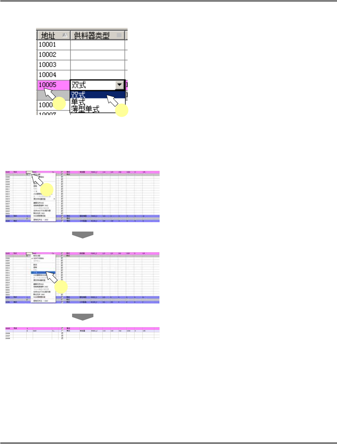 NPM-DGS 程序手册 7.6 供料器表画面 EJS9AC-MB-07P-09 Page 7-107 7.6.2 供料器表的元件跳过 1 需要跳过元件时,勾选 ‘ 跳过 ’ 。 被勾选的元件颜色发生变化。 Product070502S- 01C02 1