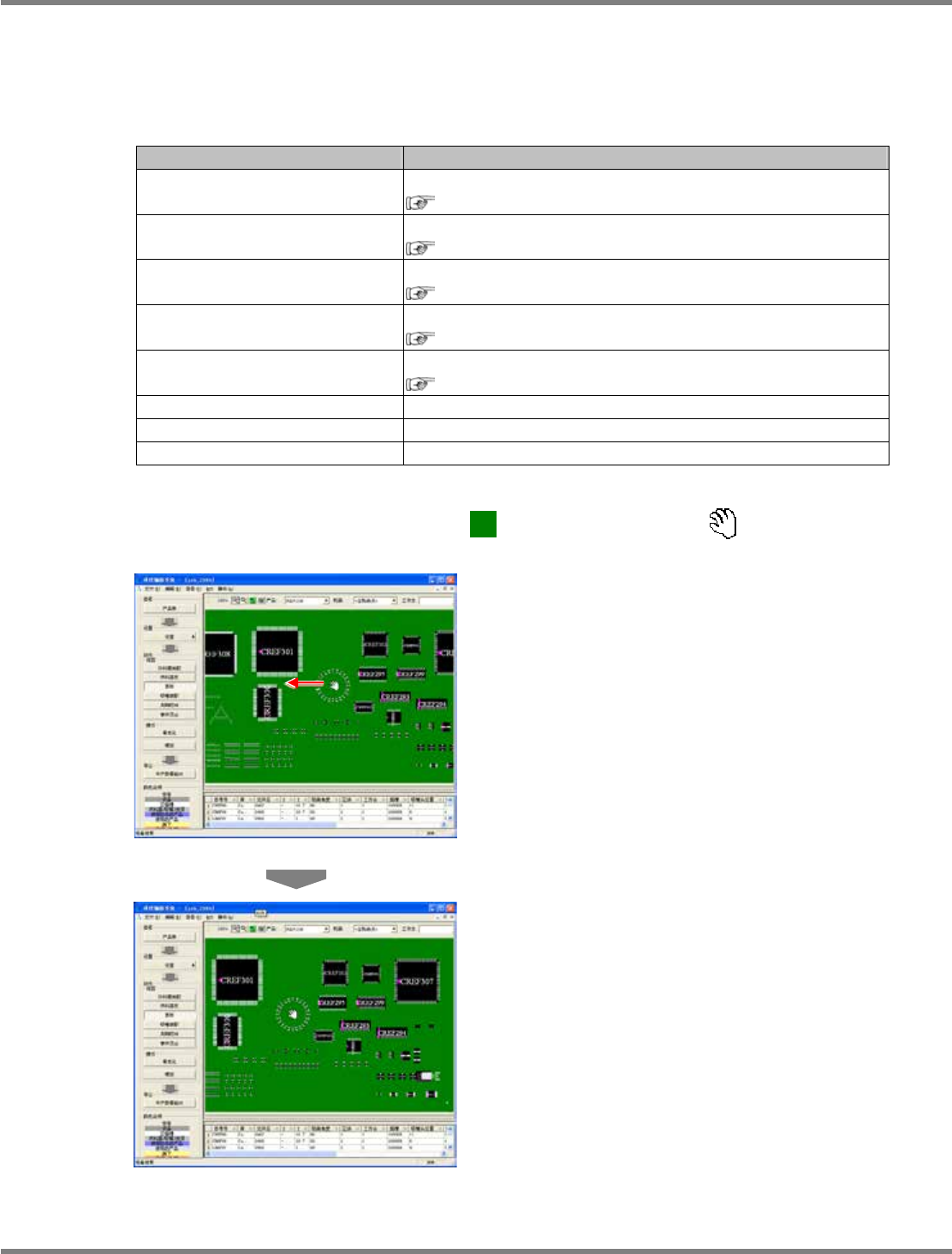 NPM-DGS 程序手册 7.7 基板画面 EJS9AC-MB-07P-09 Page 7-115 7.7 基板画面 通过基板画面确认基板上的元件装配 、在哪一个机器上进行各实装点 的实装。请在项目栏的 ‘ 动作 ’ 的 ‘ 视图 ’ 中选择 [ 基板 ] 。 ① 画面显示控制部 ( 放大显示 ) : 放大画面的显示倍率。 ( 缩小显示 ) : 缩小画面的显示倍率。 ( 缩放选择范围 ) : 在中心上扩大显示所选择的贴装点。 ( 配合基…