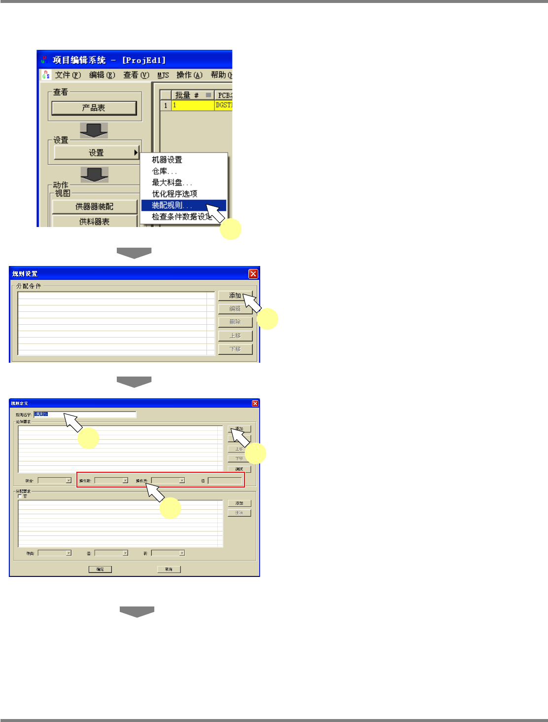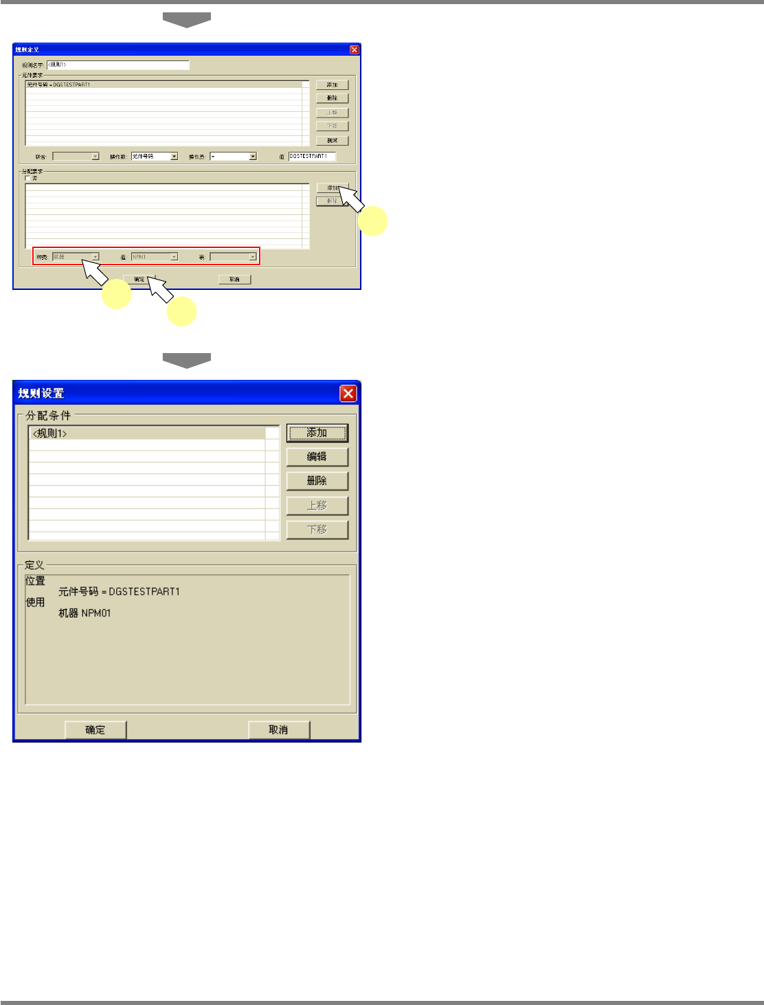 NPM-DGS 程序手册 7.8 装配规则画面 EJS9AC-MB-07P-09 Page 7-133 补充 ‘AND/OR’ 项目 说明 AND 将满足以前条件和现今追加条件的双 方条件的元件视为对象。 OR 将满足以前条件或现今追加条件中某 一方条件的元件视为对象。 ‘ 对象 ’ 、 ‘ 条件式 ’ 、 ‘ 值 ’ 对象 条件算式 值 元件名 包含= ( 等于 ) 、 ≠ ( 不等于 ) 、 下一次开始、 下一次 从元件名称一览…