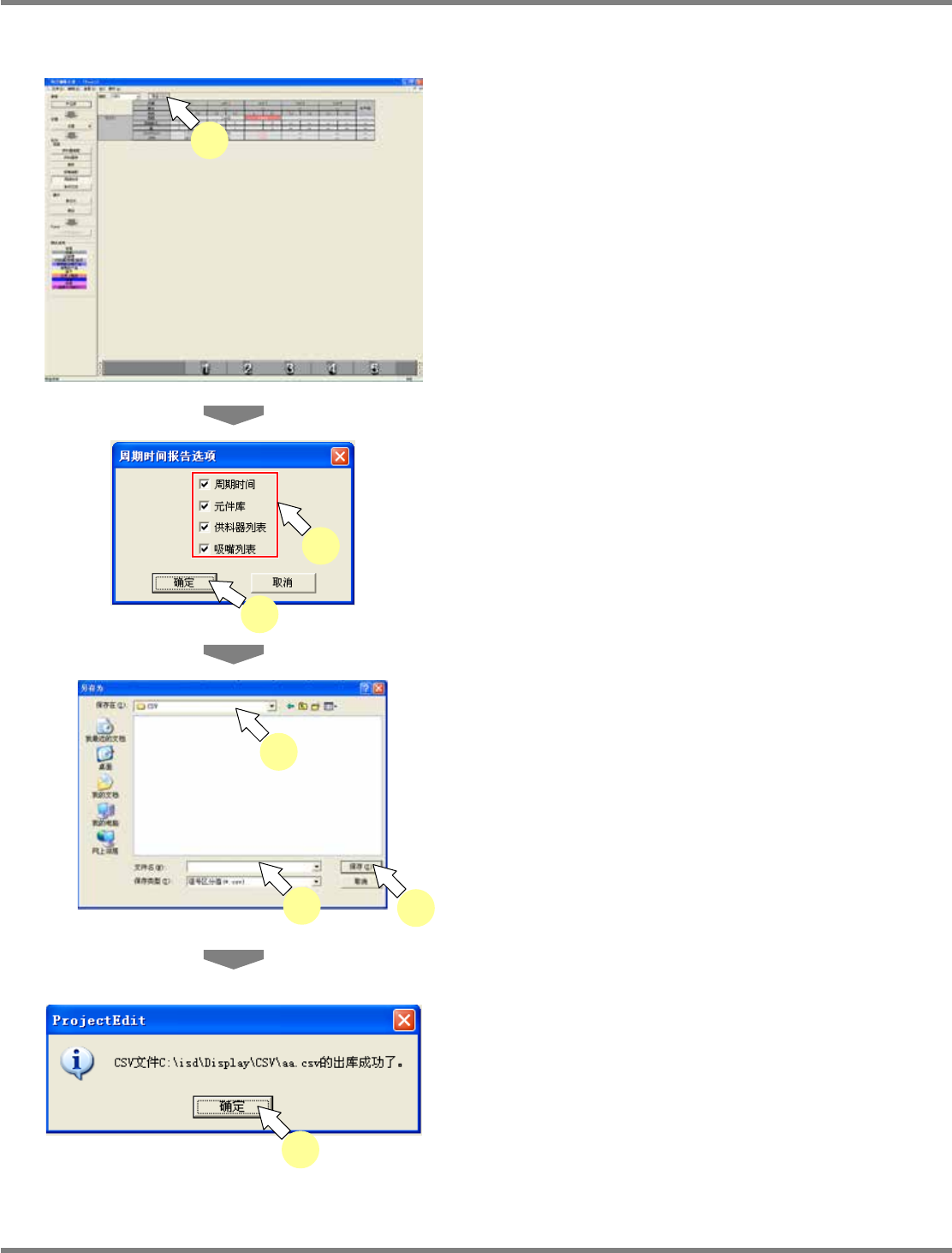 NPM-DGS 程序手册 7.9 周期时间画面 Page 7-136 EJS9AC-MB-07P-09 导出 CSV 1 点击 [ 导出 CSV] 。 将显示 < 周期时间报告选项 > 画面。 2 选择导出内容。 3 点击 [ 确定 ] 。 4 指定保存 CSV 文件的文件夹。 5 输入 CSV 文件名。 6 点击 [ 保存 ] 。 7 点击 [ 确定 ] 。 即完成了 CSV 文件的导出。 Product070…