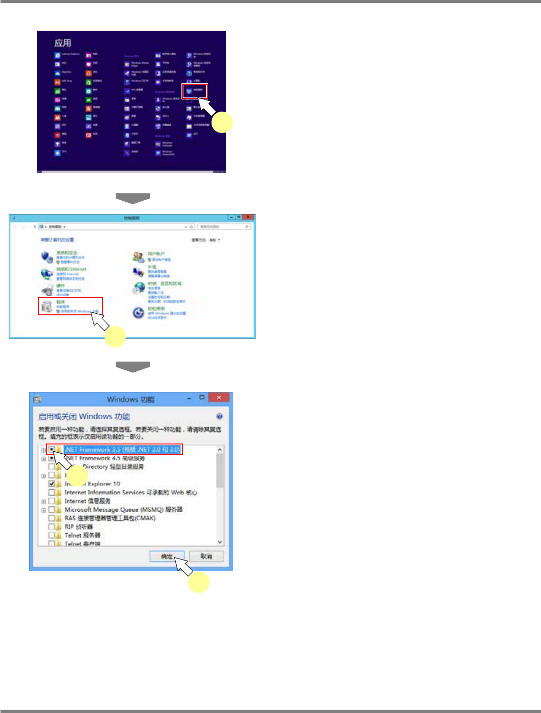 NPM-DGS 程序手册 2.1 NPM-DGS 的安装 Page 2-50 EJS9AC-MB-02P-03 连接网络时 1 在按住 [Windows] 键的同时, 按 [Q] 键打 开应用画面。 2 点击 [ 控制面板 ] 。 3 点击程序的 [ 启用或关闭 Windows 功 能 ] 。 4 勾选 [.Net Framework 3.5 (.Net 2.0 和 3.0)] 。 5 点击 [ 确定 ] 。 Install0201…
