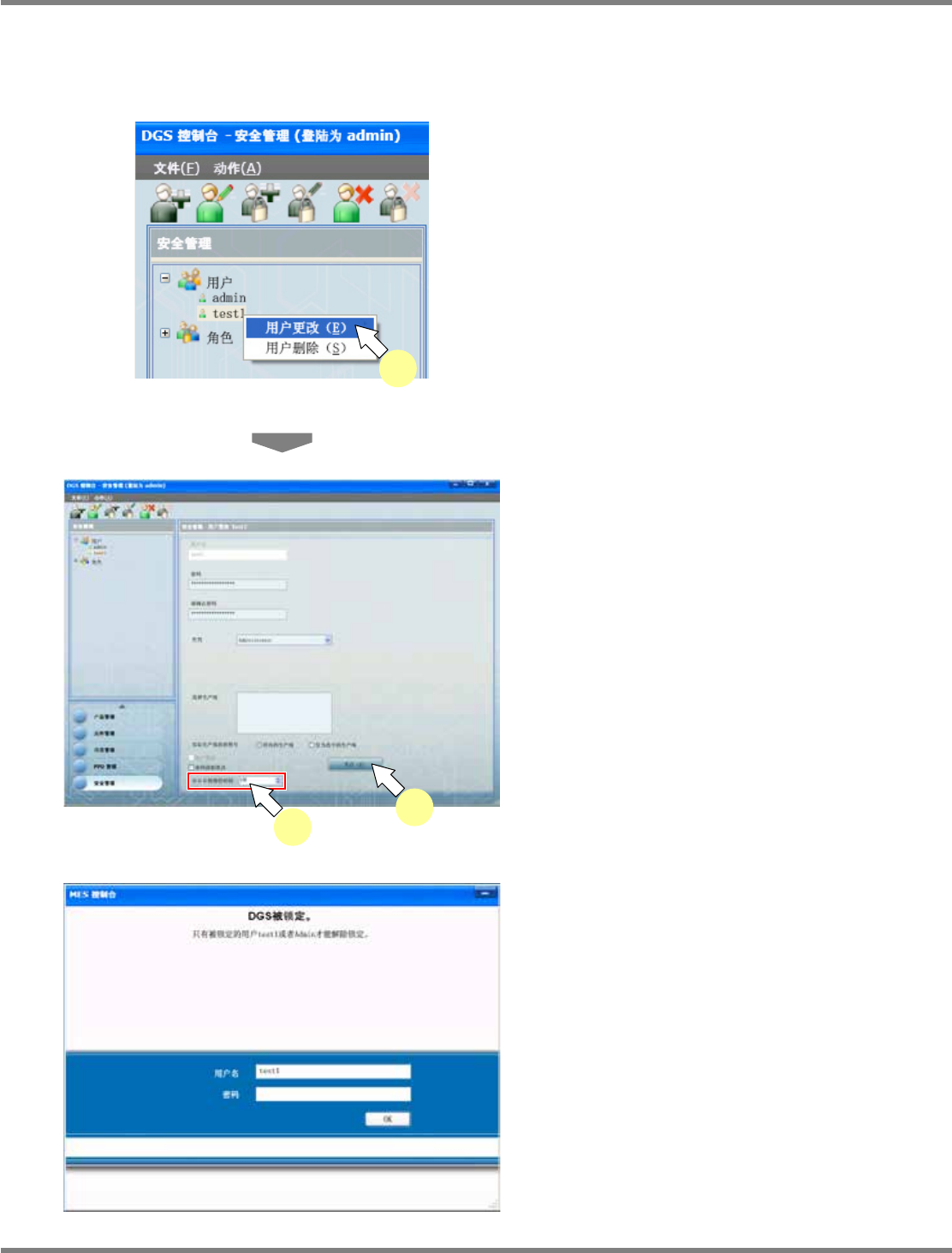 NPM-DGS 程序手册 8.1 许可证管理 EJS9AC-MB-08P-04 Page 8-19 DGS 锁等待时间的设定 当达到了所指定的 DGS 锁等待时间而 PC 没有进行操作时, DGS 将会被锁定。 处理中的操作, 即 使在锁定中也不会被中断而可继续。 1 在树形区域选择已经登录完毕的用户 后,选择右击菜单的 [ 用户更改 ] 或者选 择菜单栏的 [ 动作 ] [ 用户更改 ] 。 2 ‘DGS 锁等待时间 ’ 的文…