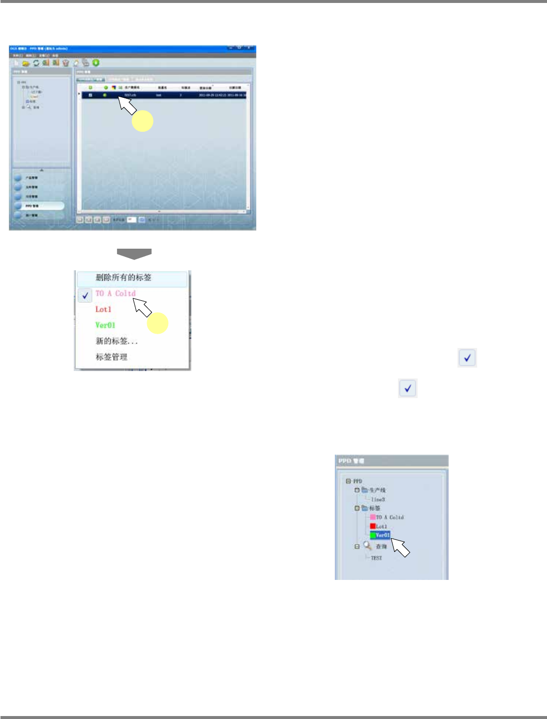 NPM-DGS 程序手册 9.2 关于 PPD 管理画面 EJS9AC-MB-09P-06 Page 9-19 管理标签 追加、删除、编辑标签。 1 从菜单栏中选择 [ 标签 ] [ 标签管理 ] , 或点击工具栏的 ( 标签管理 ) 。 2 对标签数据进行管理。 选择项目 [ 新建 ] 新建标签并登录。 [ 编辑 ] 编辑标签名称、显示颜色。 [ 删除 ] 删除所登录的标签。 PPD090203S-05C 03 1 PPD…