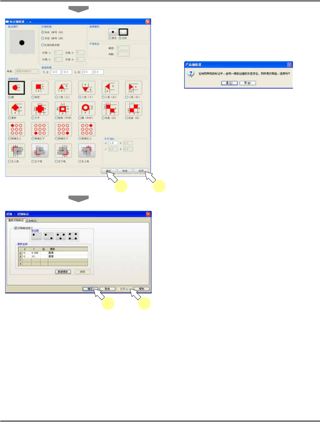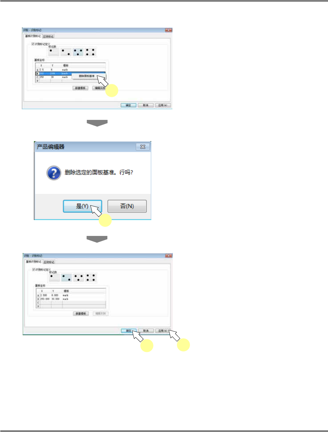 NPM-DGS 程序手册 5.8 PCB 编辑 EJS9AC-MB-05P-09 Page 5-165 ③ 选择删除面板识别基准 1 选择想要删除的面板基准后, 点击右击 菜单的 [ 删除面板基准 ] 。 2 显示出确认对话框,点击 [ 是 ] 。 将删除所选择的删除识别基准,基准 数量会减 少一个。 3 需要将变更反映至 PCB 时, 请点击 [ 确 定 ] 或 [ 应用 ] 。 Project050802S-1 30C00 1 …