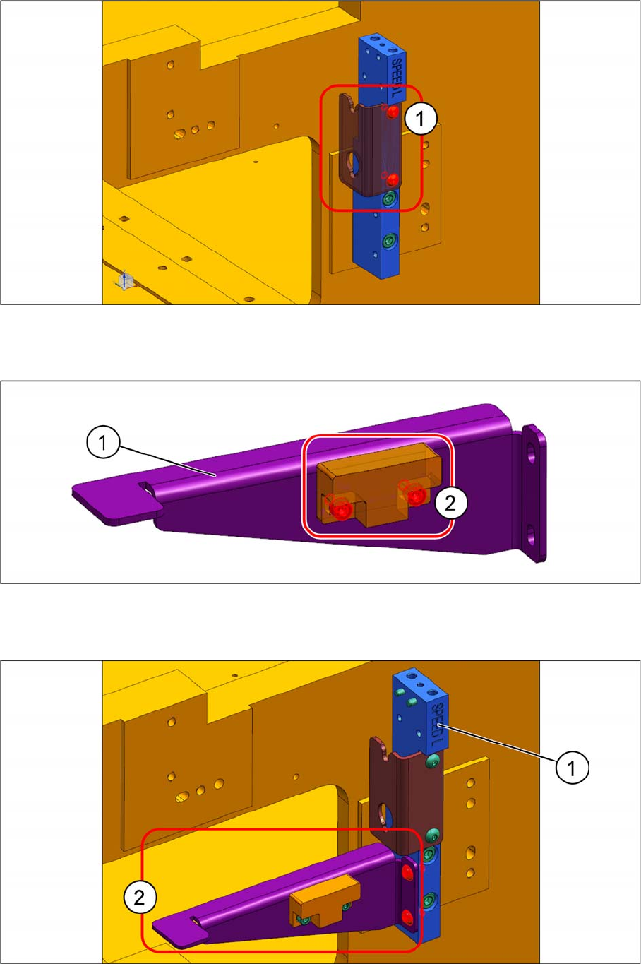 ► Mount the "sensor and sensor mount subassembly" (2) onto the "NC mount bracket Speed left"