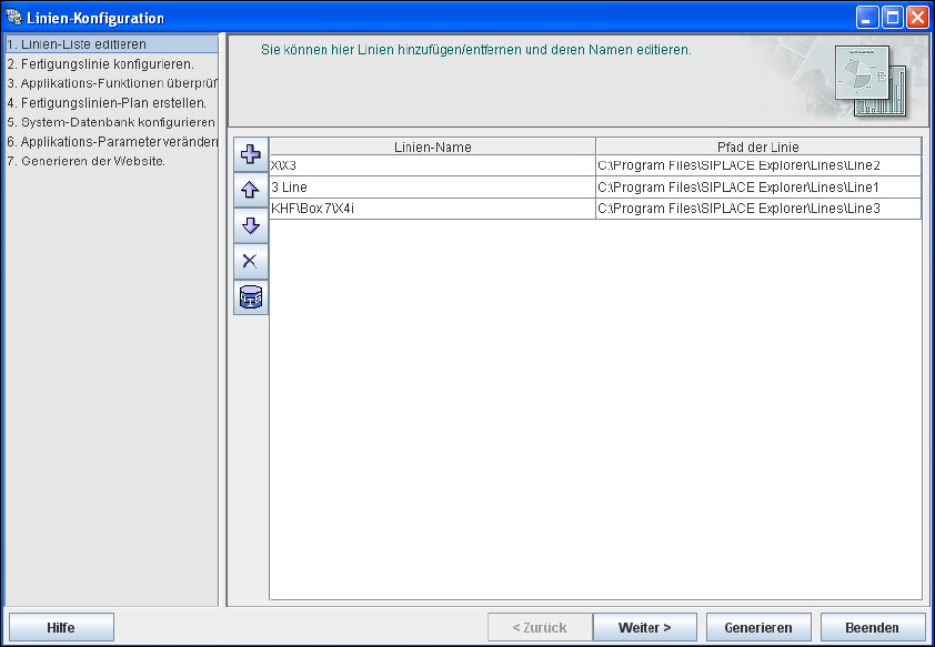 Die hinzugefügten Fertigungslinien werden in dem Dialogfenster Linien-Konfiguration -