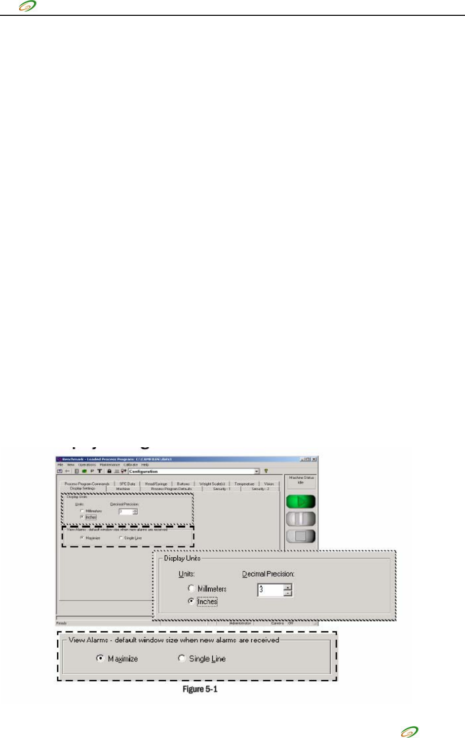 佳力科技 5 . 1 . 1 DISPLA Y UNI TS · UNITS ——选择机器显示的数值为公制还是英制 · DECIMAL PRECISION ——选择精确到小数点后的位数 ——一般情况下,英制设置 3 位,公制设置两位 5 . 1 . 2 警报窗口 · MAXIMIZE 最大化的显示警报窗口 · SINGLE LINE 仅显示最近发生的一次警报信息 5 . 2 MACHINE ( 5-2 ) 5 . 2 . 1 BA TC…