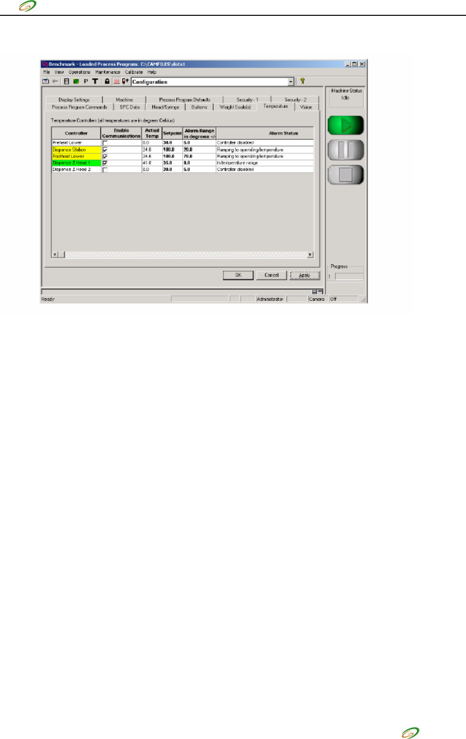 佳力科技 5 . 9 TEMPERA TURE 5 . 9 . 1 提供每个加热区的温度设定 · CONTROLLER ——每个加热区的名字,对于单轨的最多有 6 个,双轨的最多有 10 个 · ENABLE COMMUNICA TIONS ——选择激活所需的加热区 · ACTUAL TEMP ——显示出由温度感应器感应到的加热区的实际温度 · SET POINT ——指此加热区温度设定的目标值 · ALARM RANGE IN DEG…