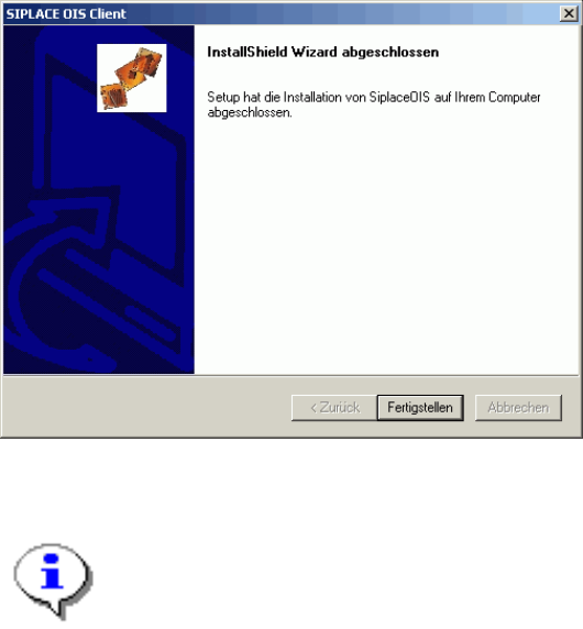 Installationsanleitung OIS Client, OI S Server, SIS Server Version 7.0 Installation Manual 3.2.5 Beenden der Installation Wenn der Installationsvorgang ab geschlossen ist, erscheint der na chfolgende Dialog. ¾ Klicken Si…