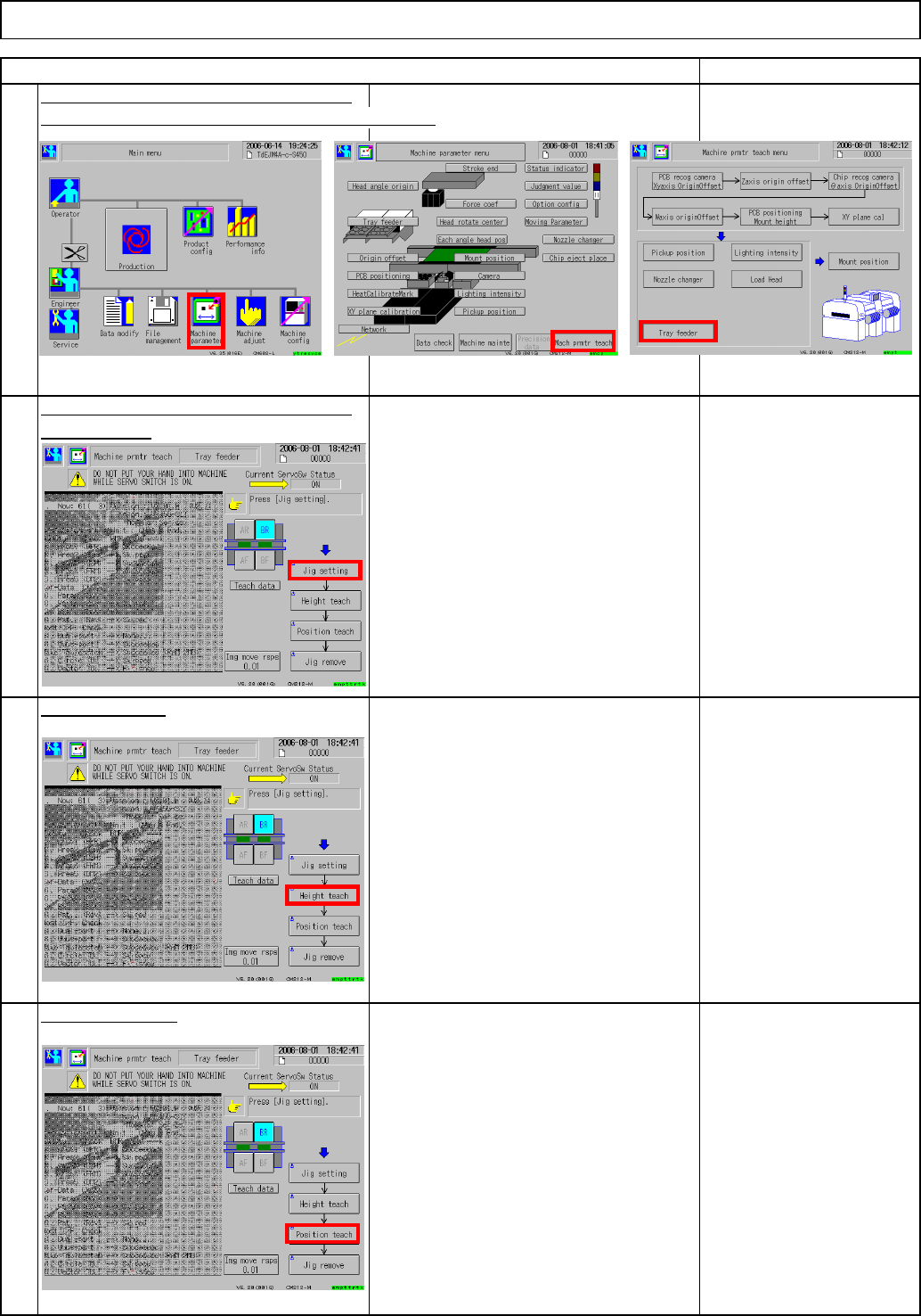 Tray Direct Tray Remark Item (9) Press [Jig remove]. (10) Turn off (O) the servo switch. (11) Open the safety cover. (12) Remove the nozzle from the head. (5) Close the safety cover. (6) Turn on (I) the servo switch. 5 R…