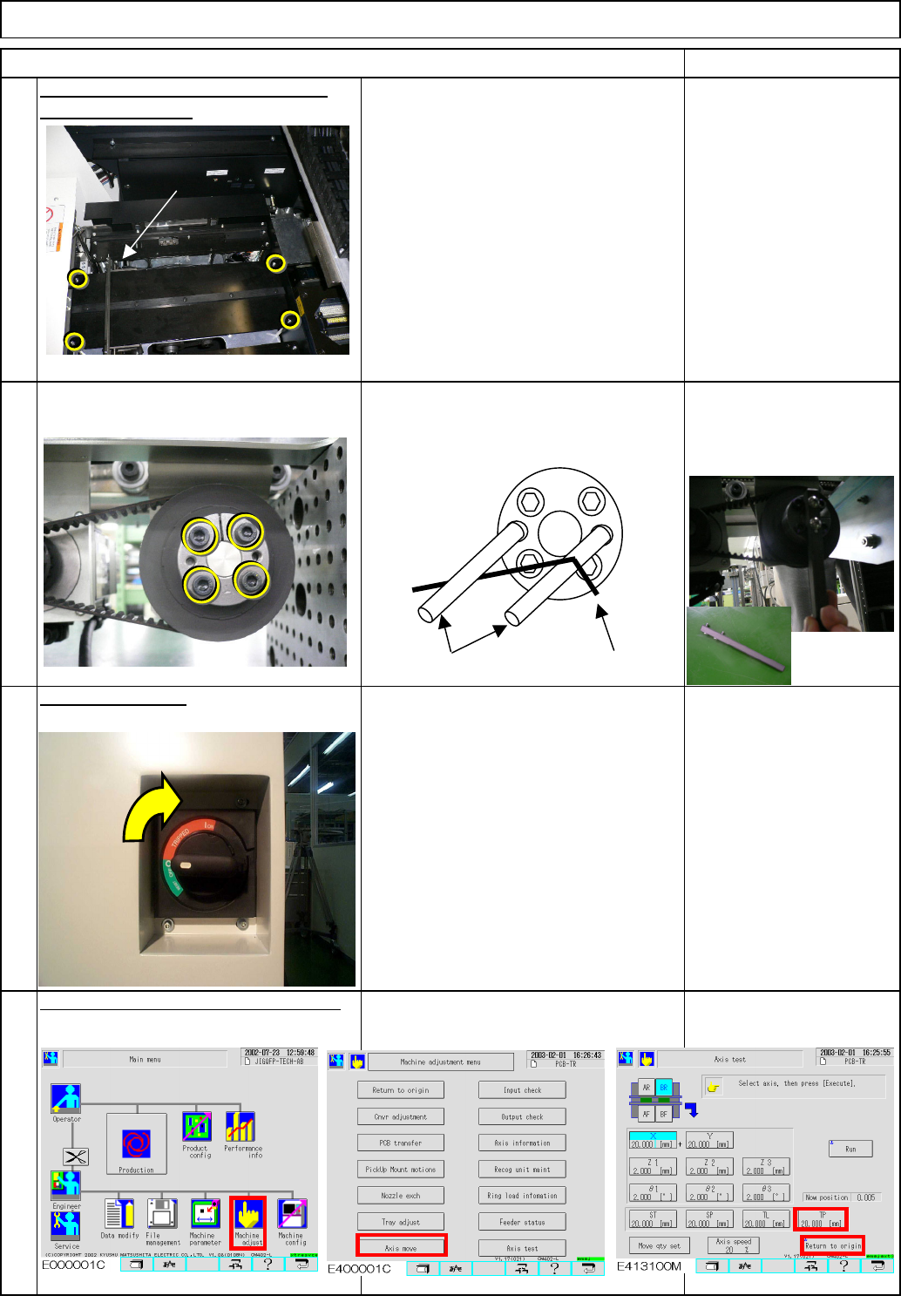Put the palette table back on with the four Hexagon bolts. Return the extension-axis to the origin. Allen key 2 mm Phillips screwdriver #1 M3 6 pcs. Truss 6 pcs. Direct Tray Item Remark Tray 9 Allen key 4 mm Screw M5 4 p…