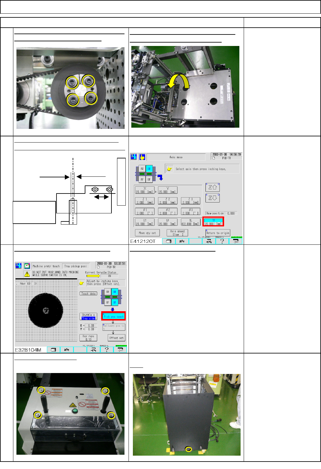 19 Carry out pickup position teaching. Rear Phillips screwdriver #2 Screw M4 4 to 6 pcs. 20 Put the cover back on. See the followings: Section 7-2-2 Direct Tray Pickup Position Teaching Section 7-2-3 Magazine Shutter Sto…
