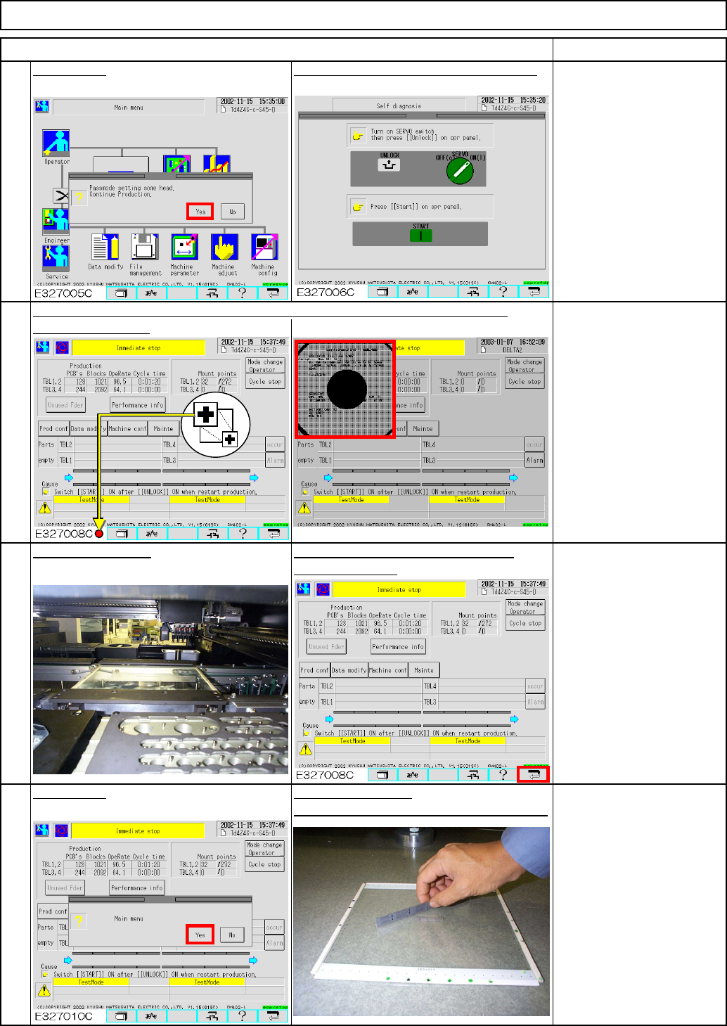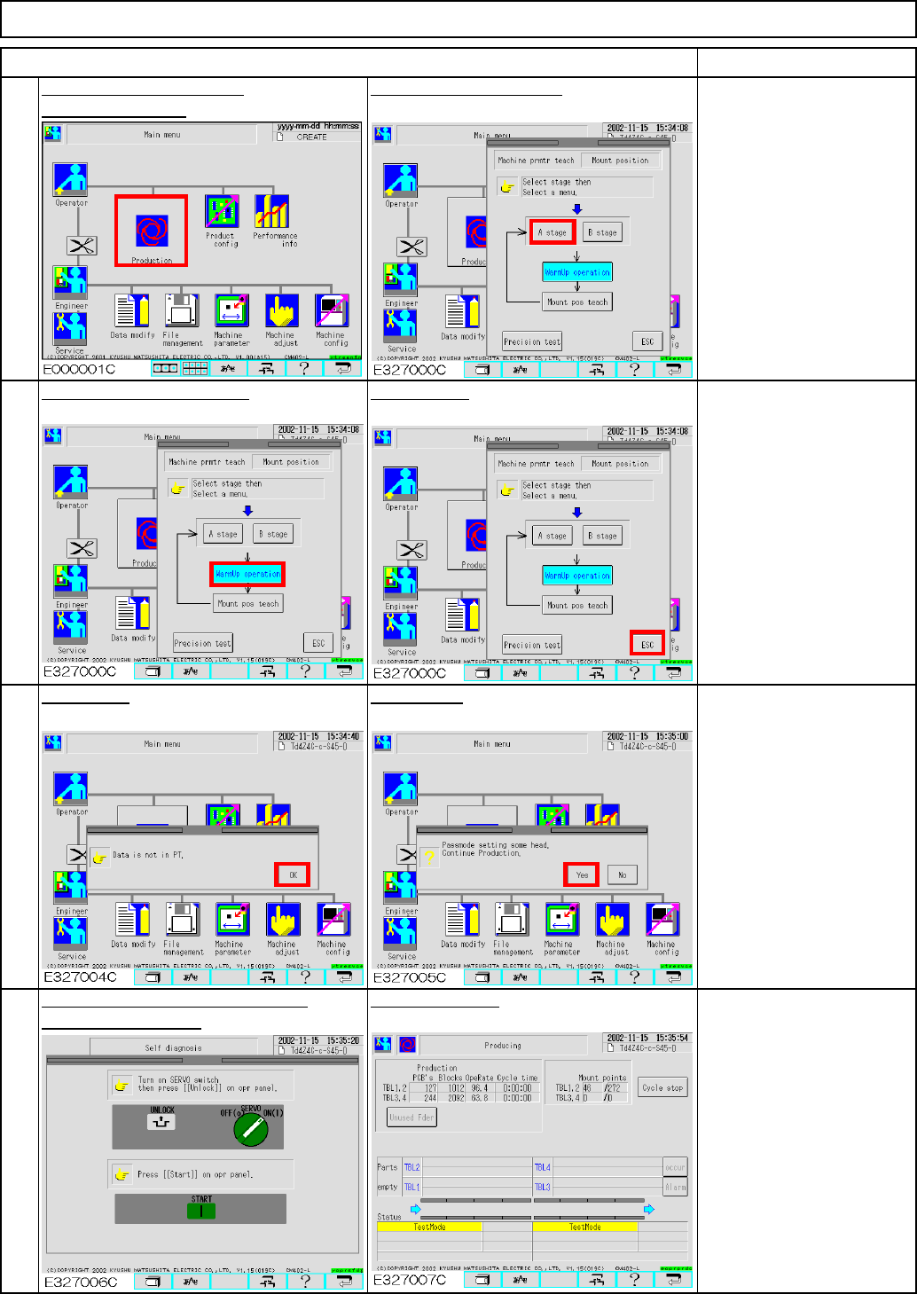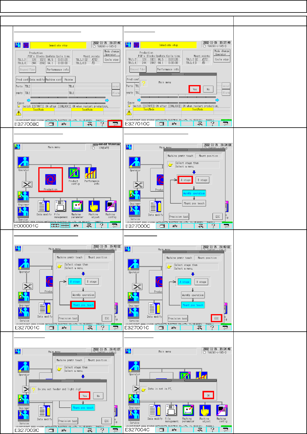 治具基板挿入? PT データ無し 19 Press [Mount pos teach]. 17 Press the "Return" switch. 20 18 Maintenance Adjustment Select the desired stage. ITEM Light Transfer-Head Assembly (8 nozzles) Press [ESC]. Press [Production]. …