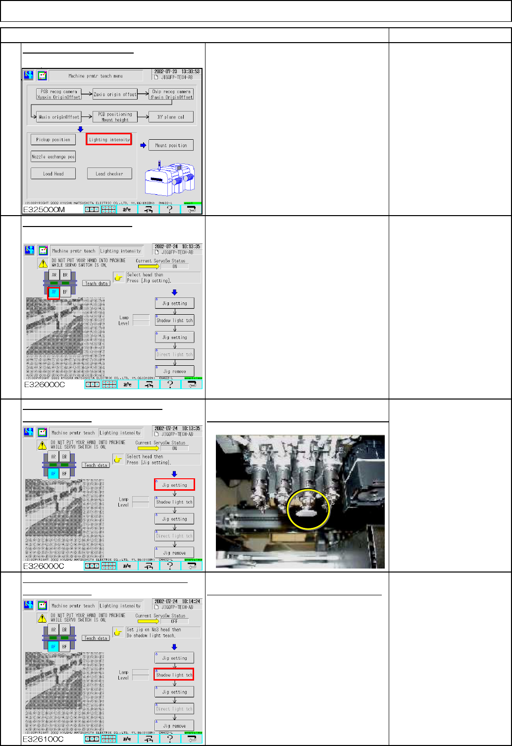 (over the NG box). camera. Light Transfer-Head Assembly(8 nozzles) Remarks Lamp Value Range: 0 to 255 Maintenance Adjustment Select the desired stage. Press [Lighting intensity]. Press [Unlock] and [Jig setting] simultan…