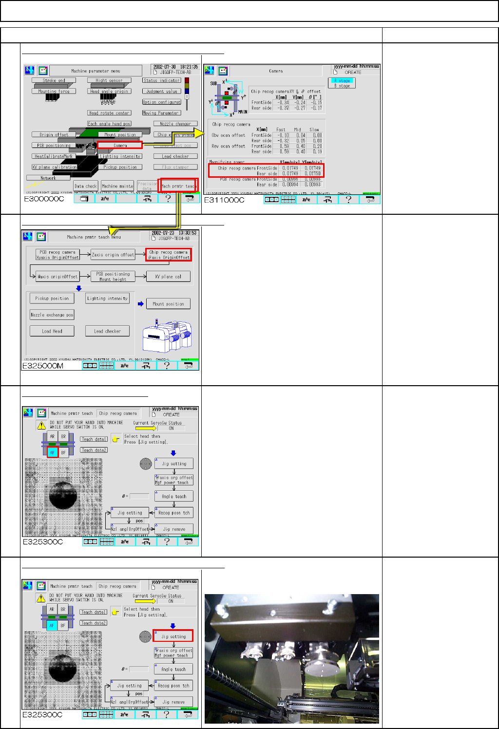 Maintenance Adjustment Light Transfer-Head Assembly (3 nozzles) Remarks Press [Chip recog camera θ axis OriginOffset]. If 0 is displayed in the "Magnifying power" boxes shown at left, enter a tentative vale of …