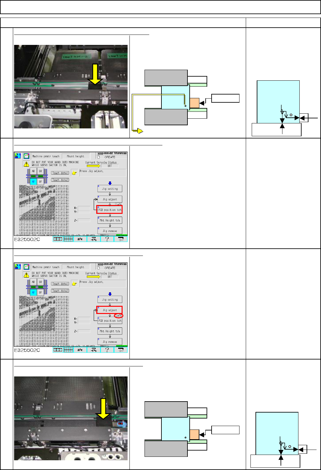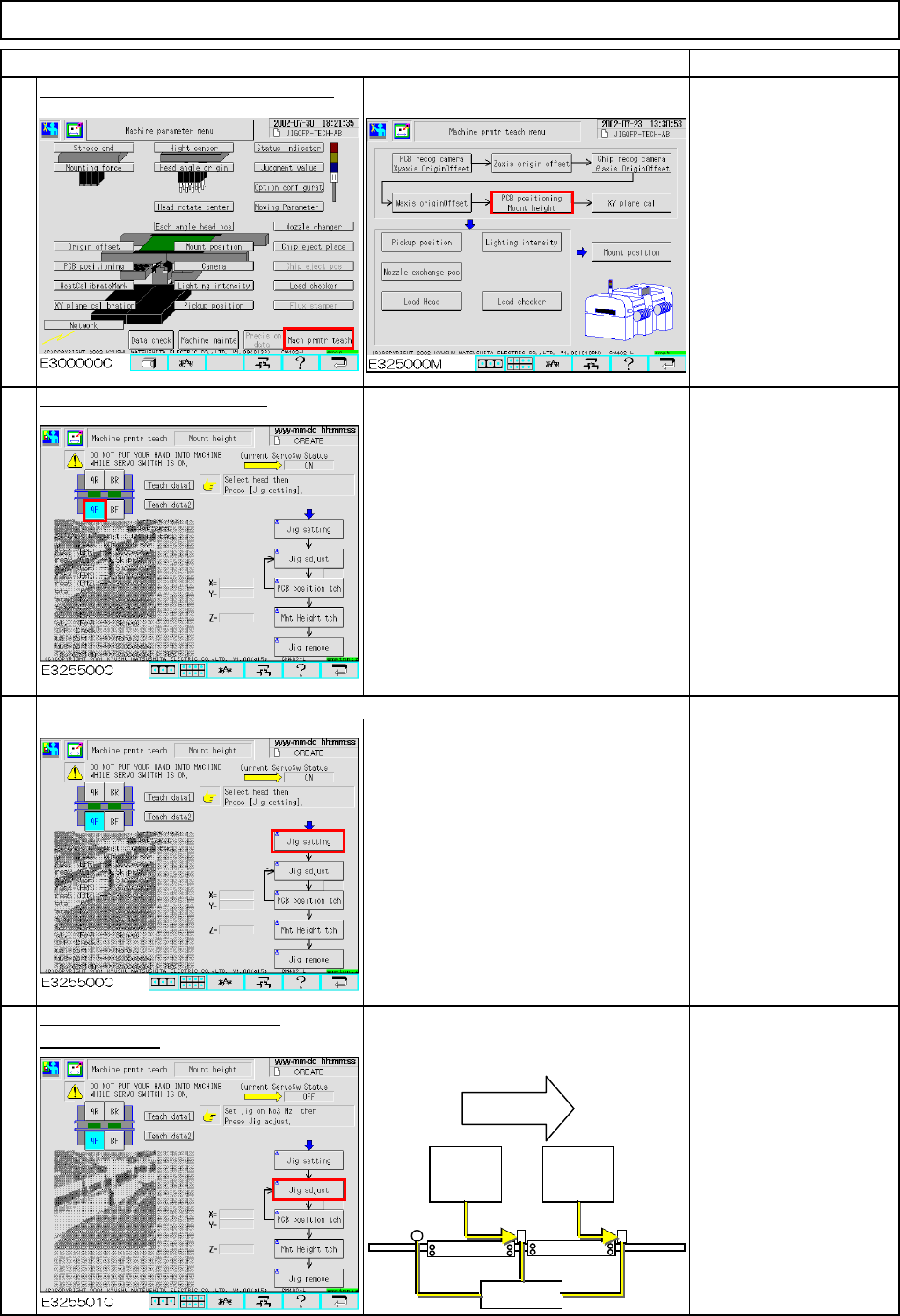 Maintenance Adjustment Light Transfer-Head Assembly (3 nozzles) Remarks Press [PCB positioning Mount height]. Be sure to remove the support pins beforehand since the width of the conveyor is adjusted in this step. The co…