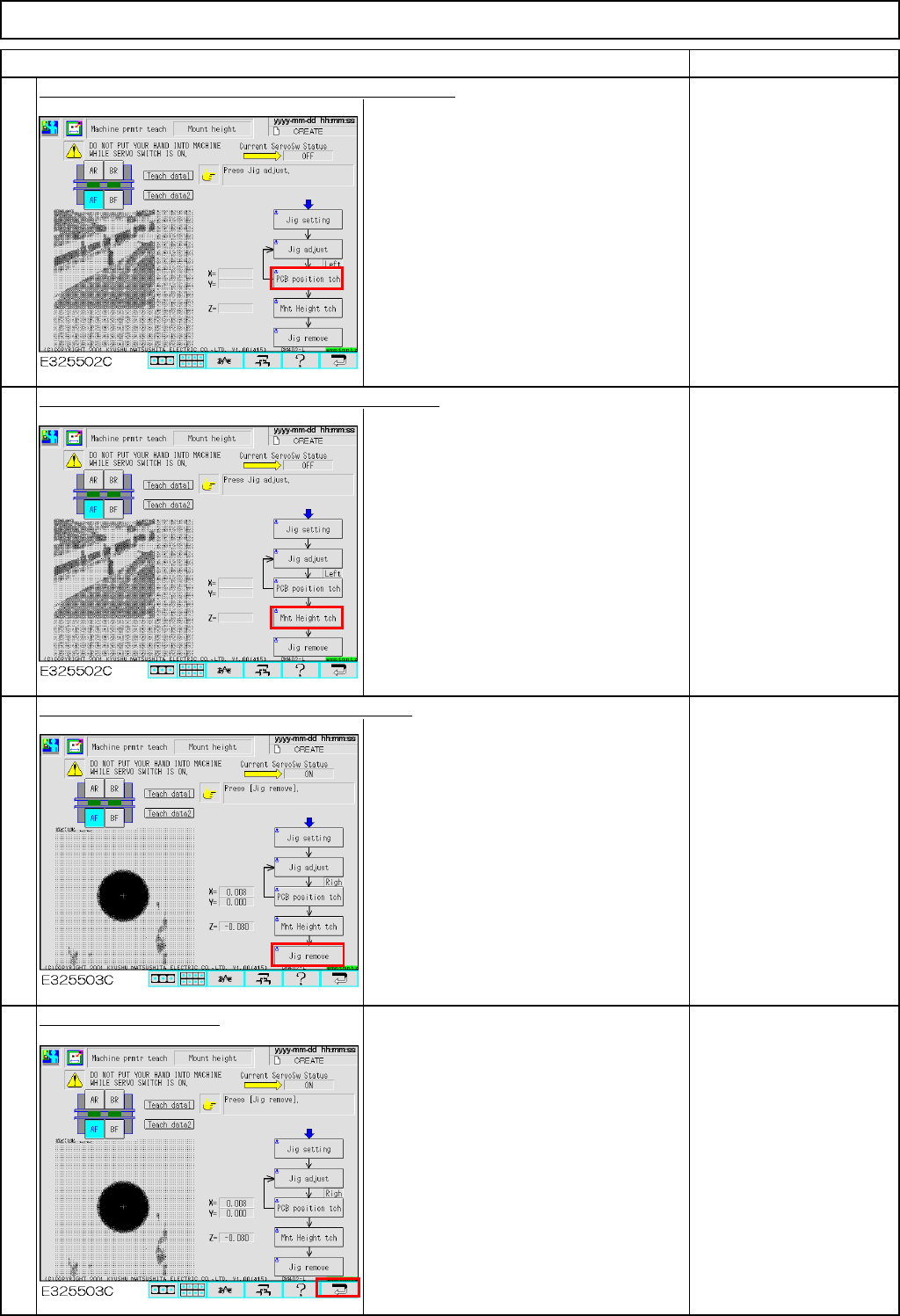 Maintenance Adjustment Light Transfer-Head Assembly (3 nozzles) Remarks Item Press the "Unlock" key and [Run] simultaneously. All axes of the selected stage return to the origin. Press [PCB positioning Mount he…