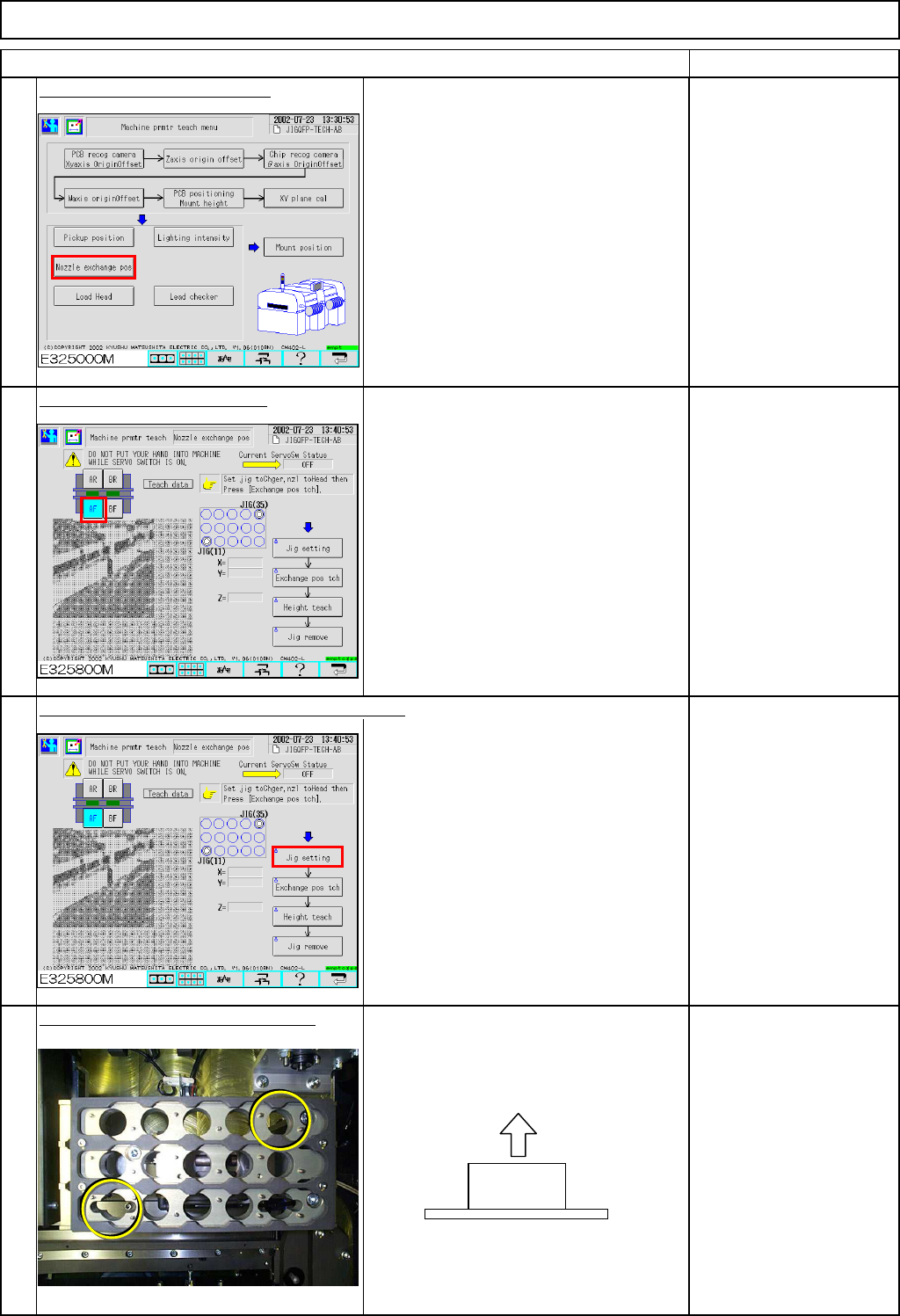 Maintenance Adjustment Light Transfer-Head Assembly (3 nozzles) This section describes the procedures for determining the nozzle exchange position. ・ Tools None ・ Jig FM-0727 Position Teaching Jig Nozzle 1003 4-3-9 Nozzl…