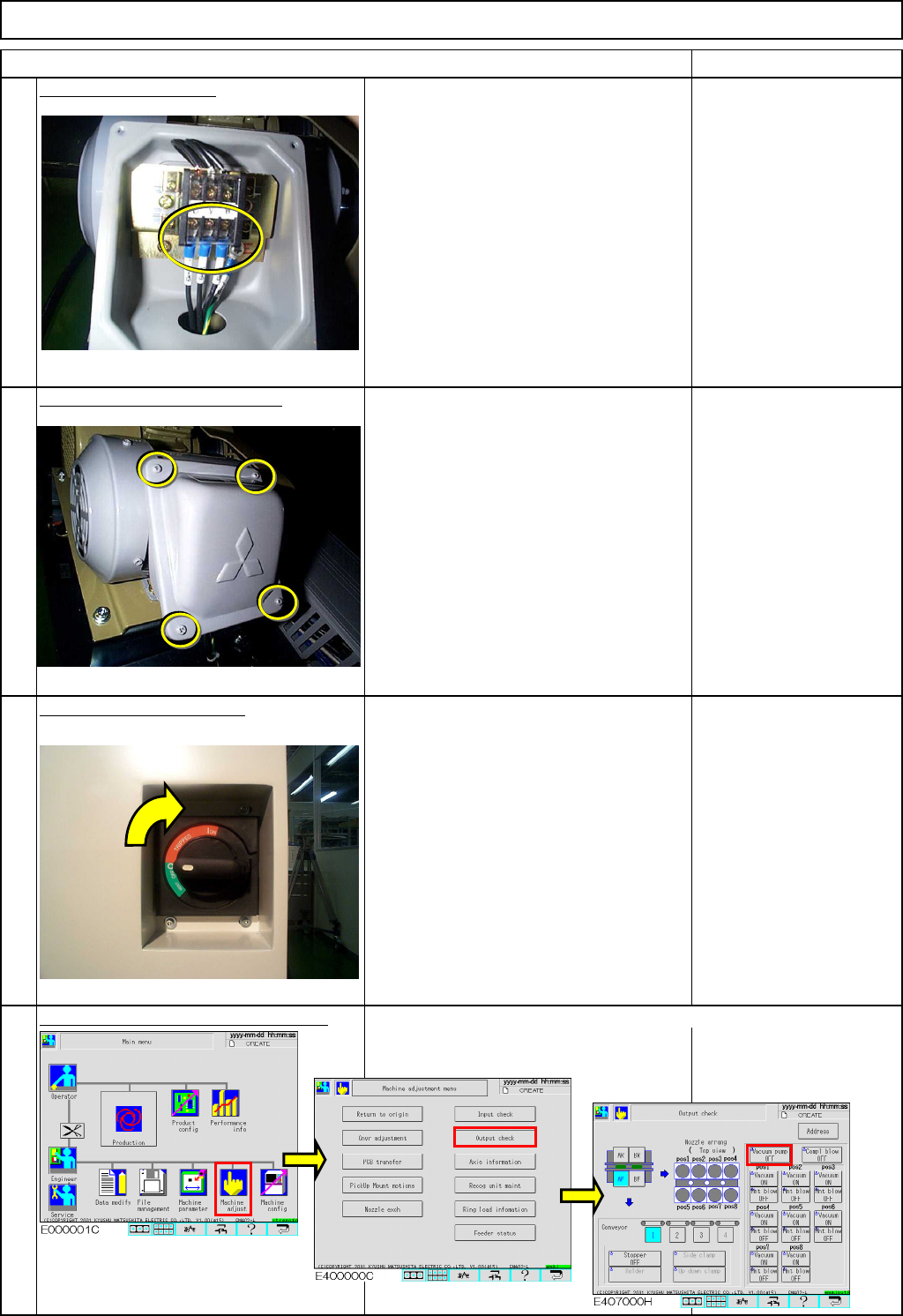 Machinery Part Replacement Main Body Remarks Item Connect the terminals. Phillips screwdriver #2 Screw M4 4 pcs. Put the terminal cover back on. Phillips screwdriver #2 Screw M4 4 pcs. Switch on the main power. Turn the …