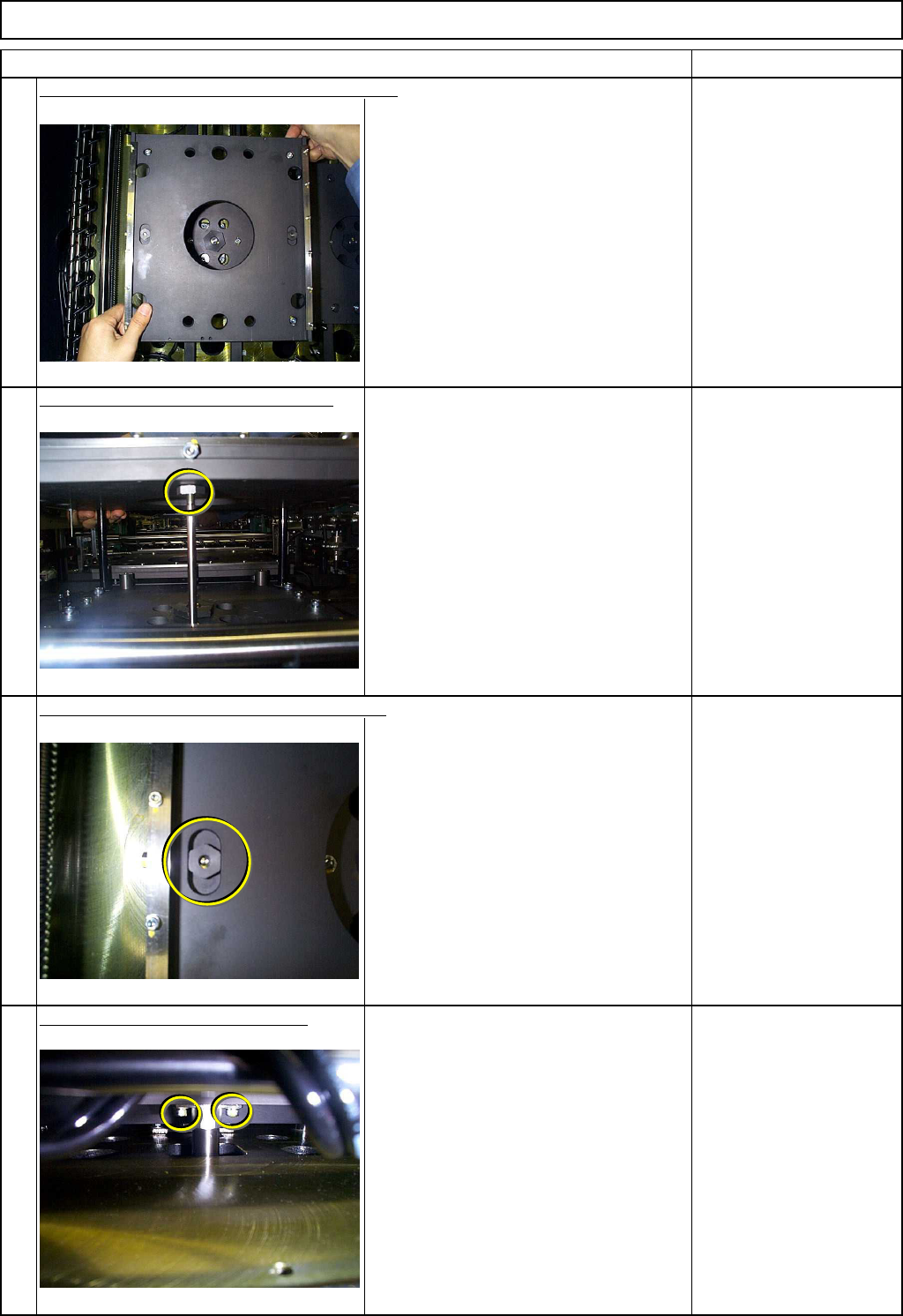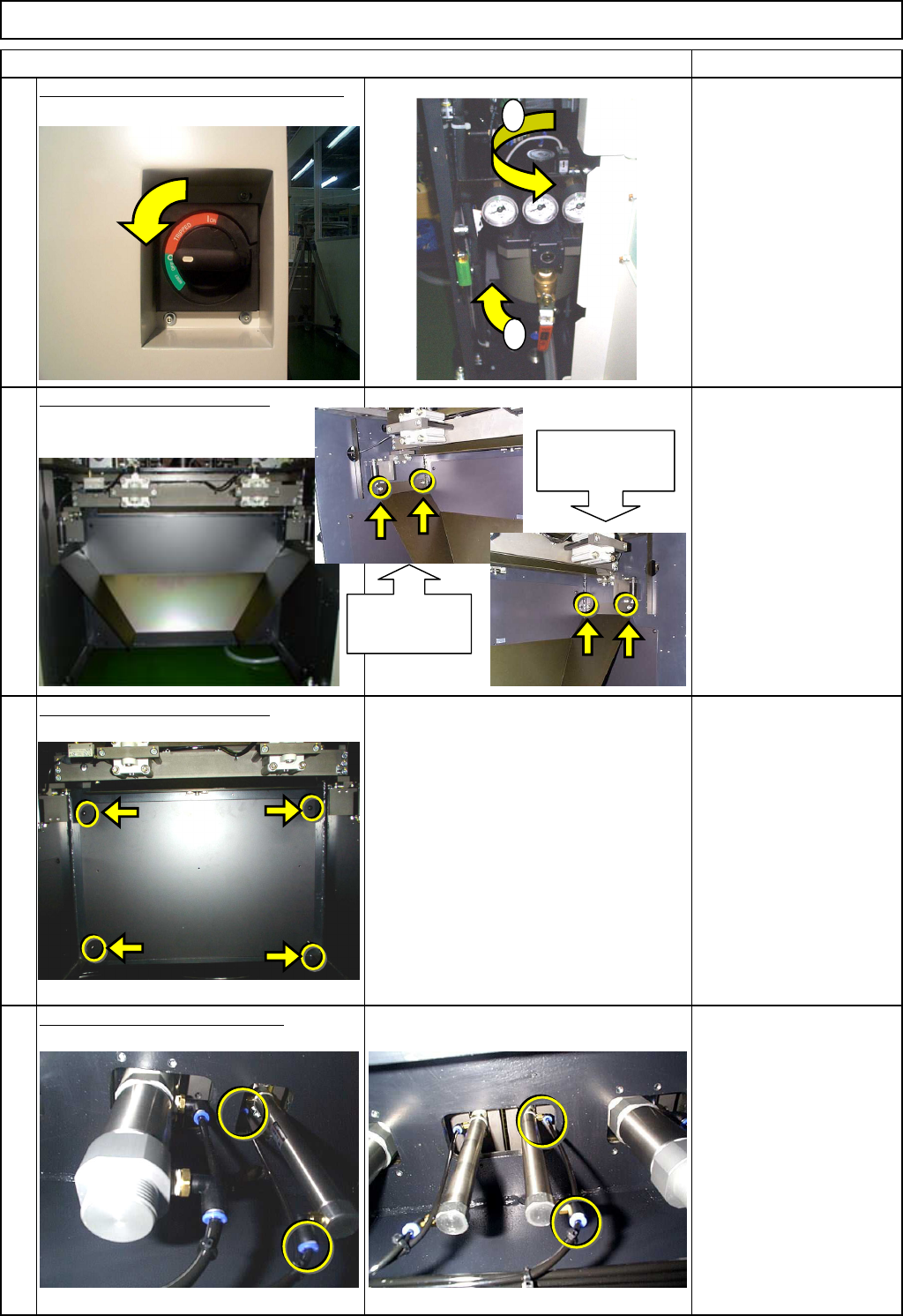 Machinery Part Replacement Board Holder Unit Remarks Turn off the main power and air supply. カバー達 From 0.49MPa to 0.55MPa Remove the lower rear chute. カバー達 Allen key 4 mm Screw M5x12mm 4 pcs. Thick washer 4 pcs. Remove…