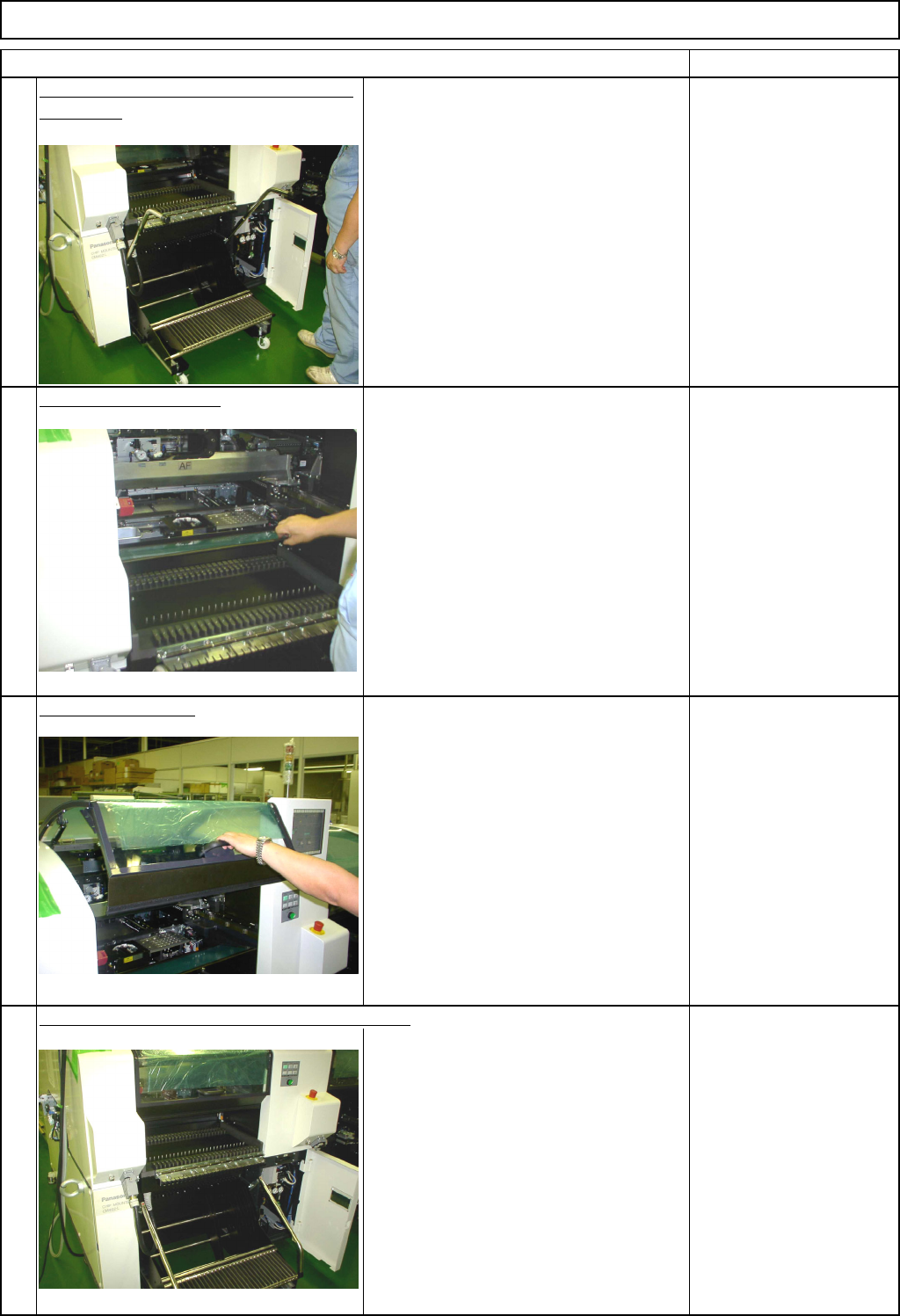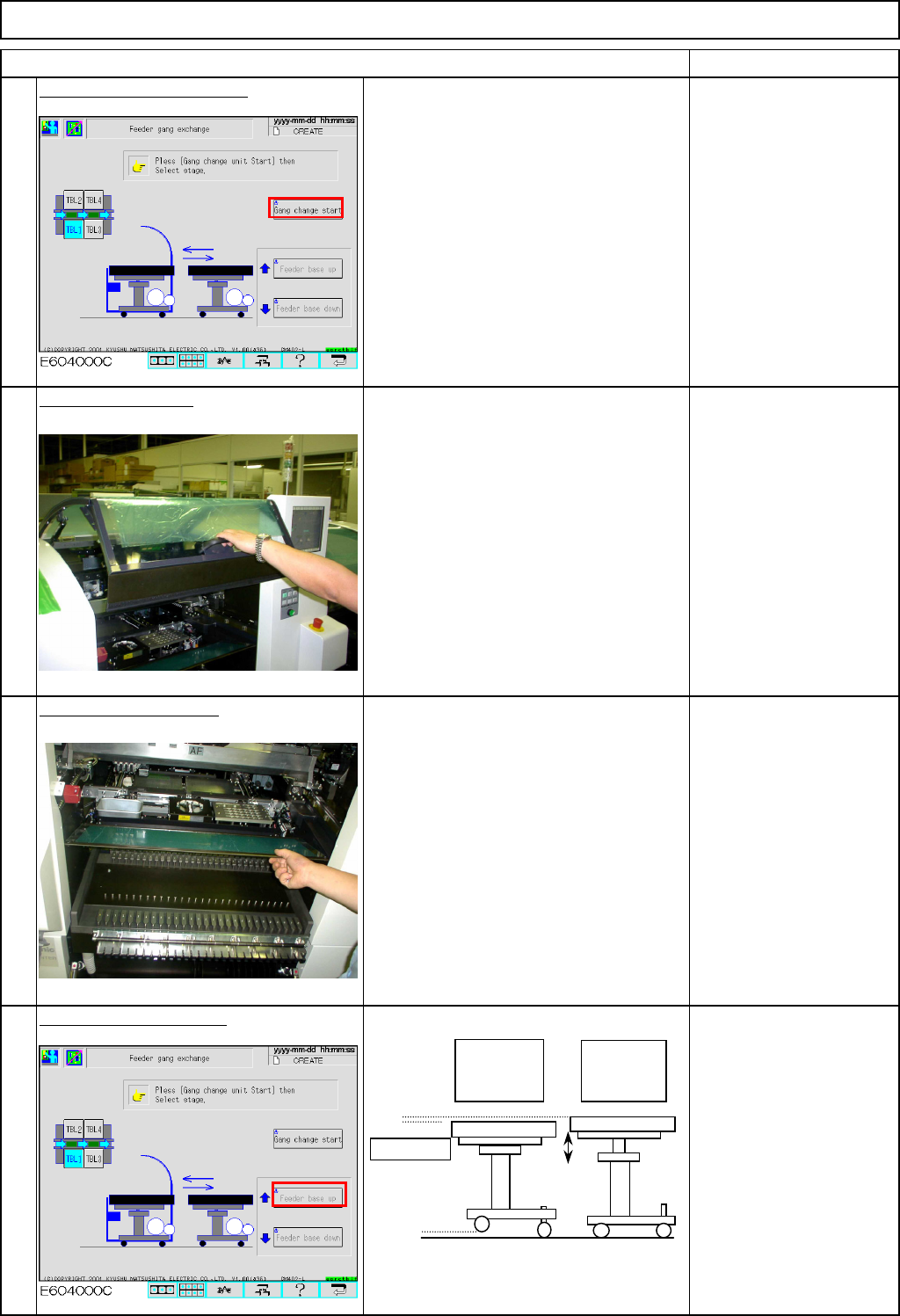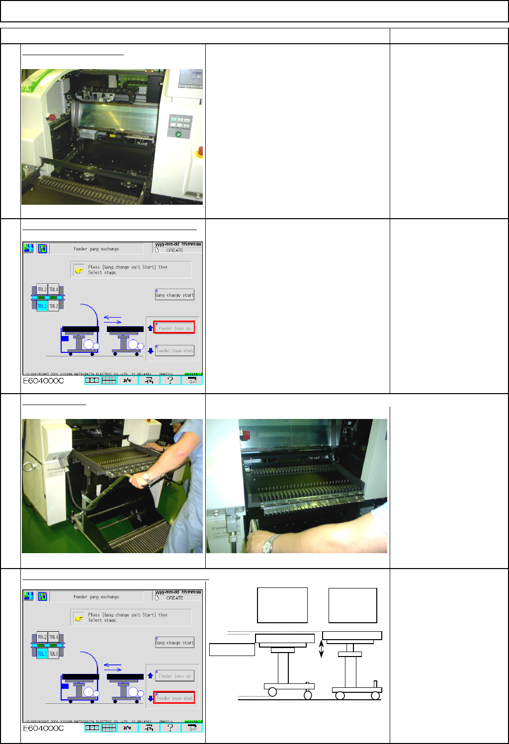 Machinery Part Replacement Remarks Feeder Gang Exchange Cart Holding Section Item The unit table is lowered and the casters are raised. Close the feeder cover. The machine judges whether the feeder cover is open or close…