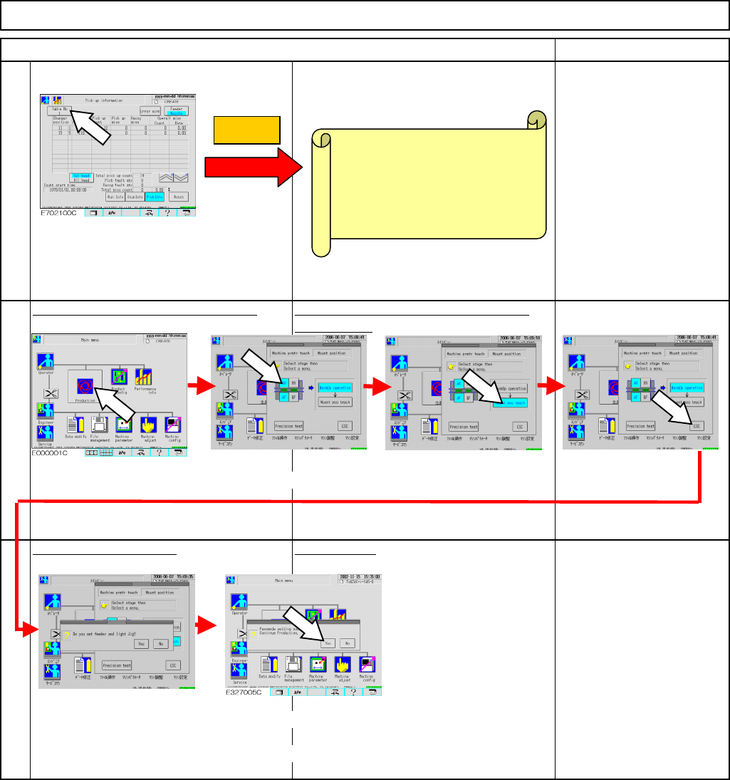 Press [Complete]. Press [Performance info]. Press [Reset]. Press [Run]. Press [Yes]. Press [Performance info]. Press [Pick Info]. Press [Error scrn]. Press [Reset]. Remarks Item 12-Nozzle Head Teaching Press [Next pick p…