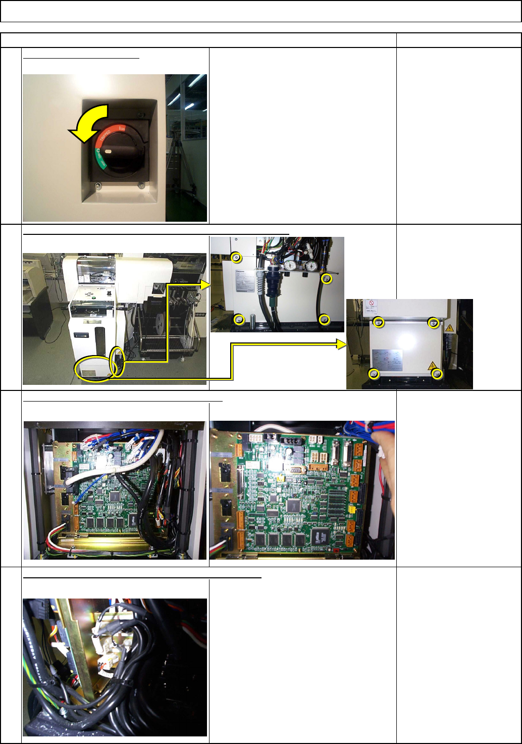 2 1 90578 Remarks Power down the machine. Phillips precision screwdriver Connector screw Item Shuttle Tray Phillips screwdriver #2 Screw M4 4 pcs. Remove all connectors from the front board. Remove the connector from the…
