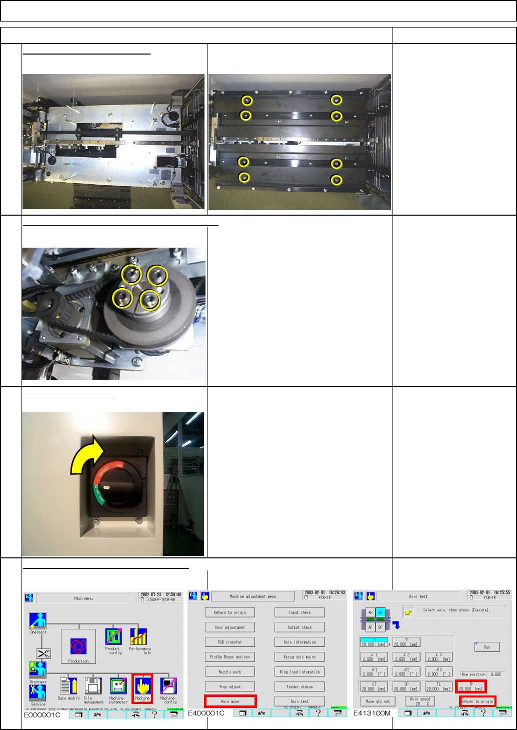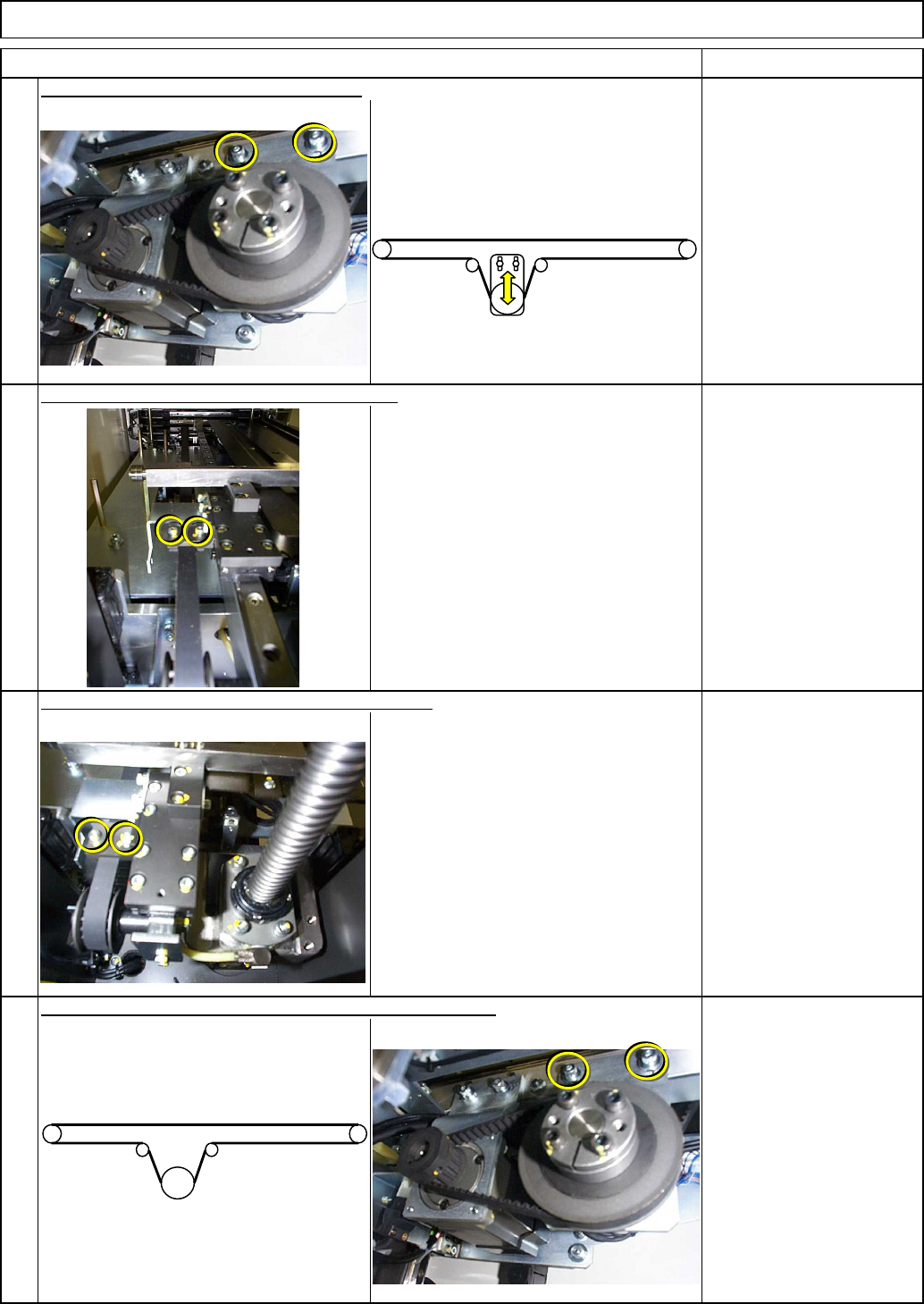 Remove the belt clamp unit. Replace the belt. Loosen the tensions at the motor section. Allen key 3 mm Screw M4 2 pcs. After replacing the belt, tighten the belt clamp unit. Position the belt. Tighten the tensions at the…