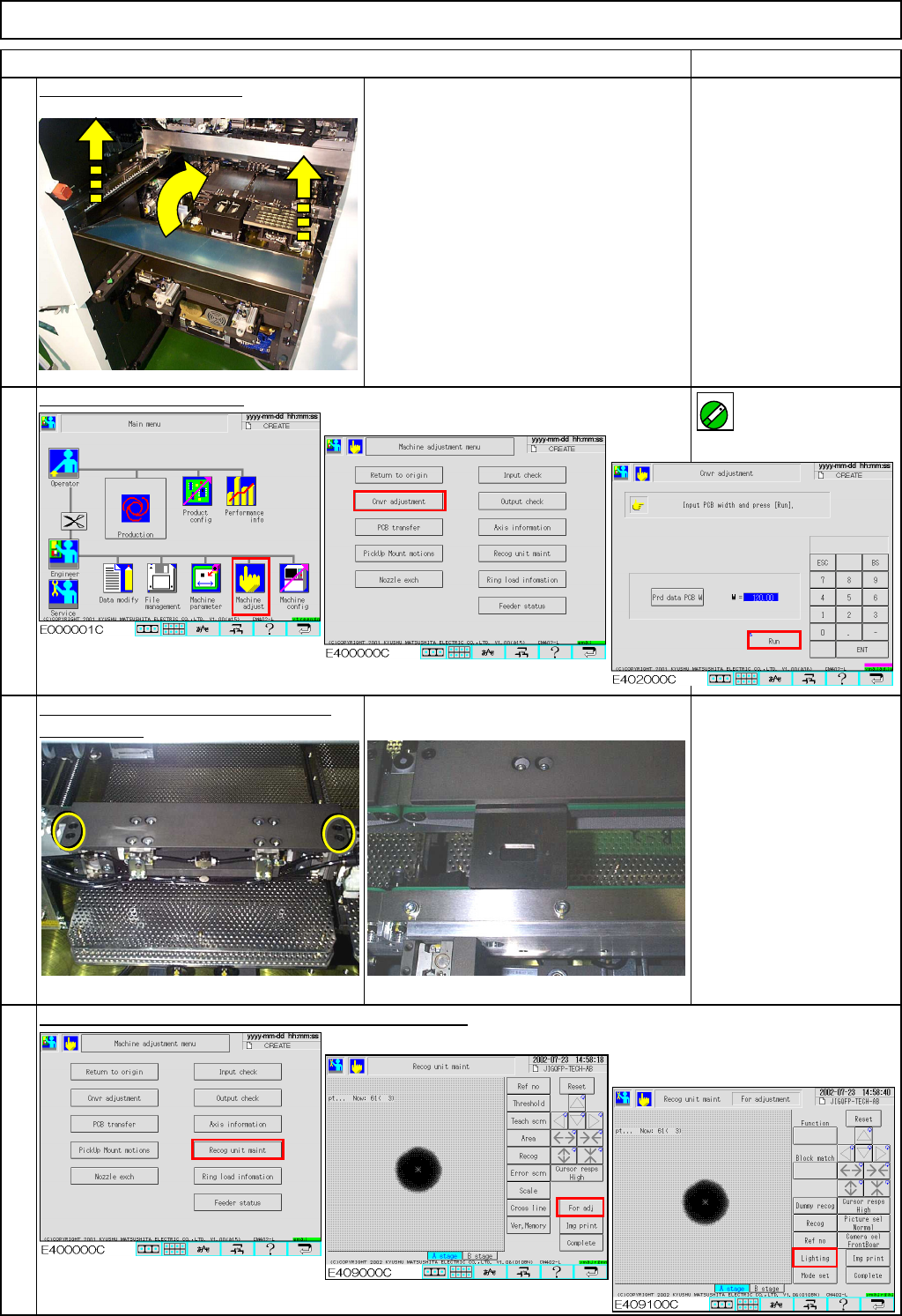 "Recognition unit maintenance For adjustment" screen