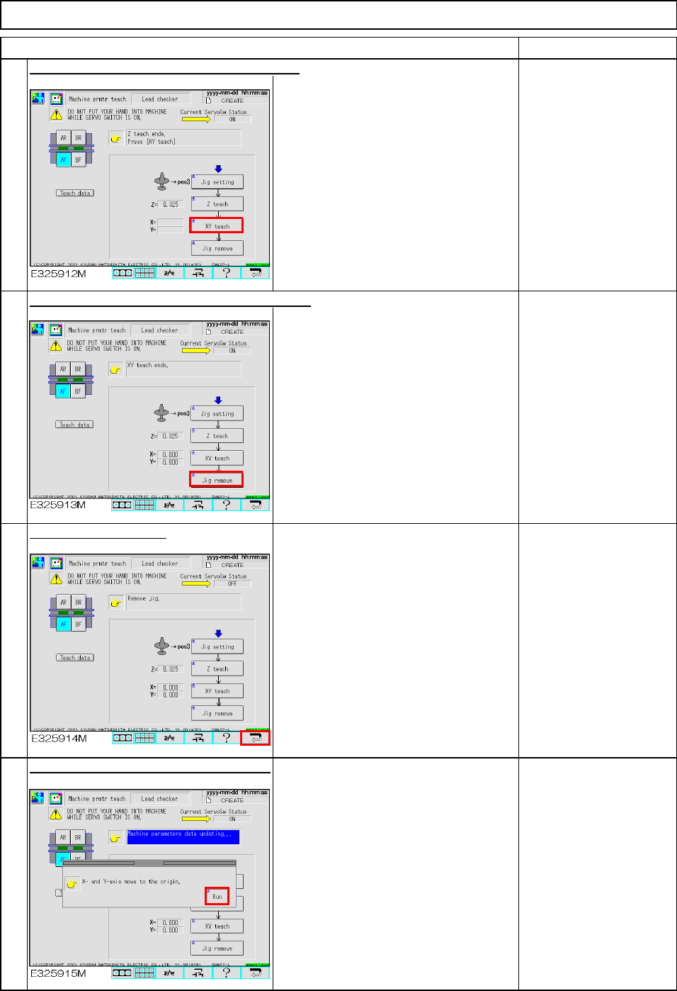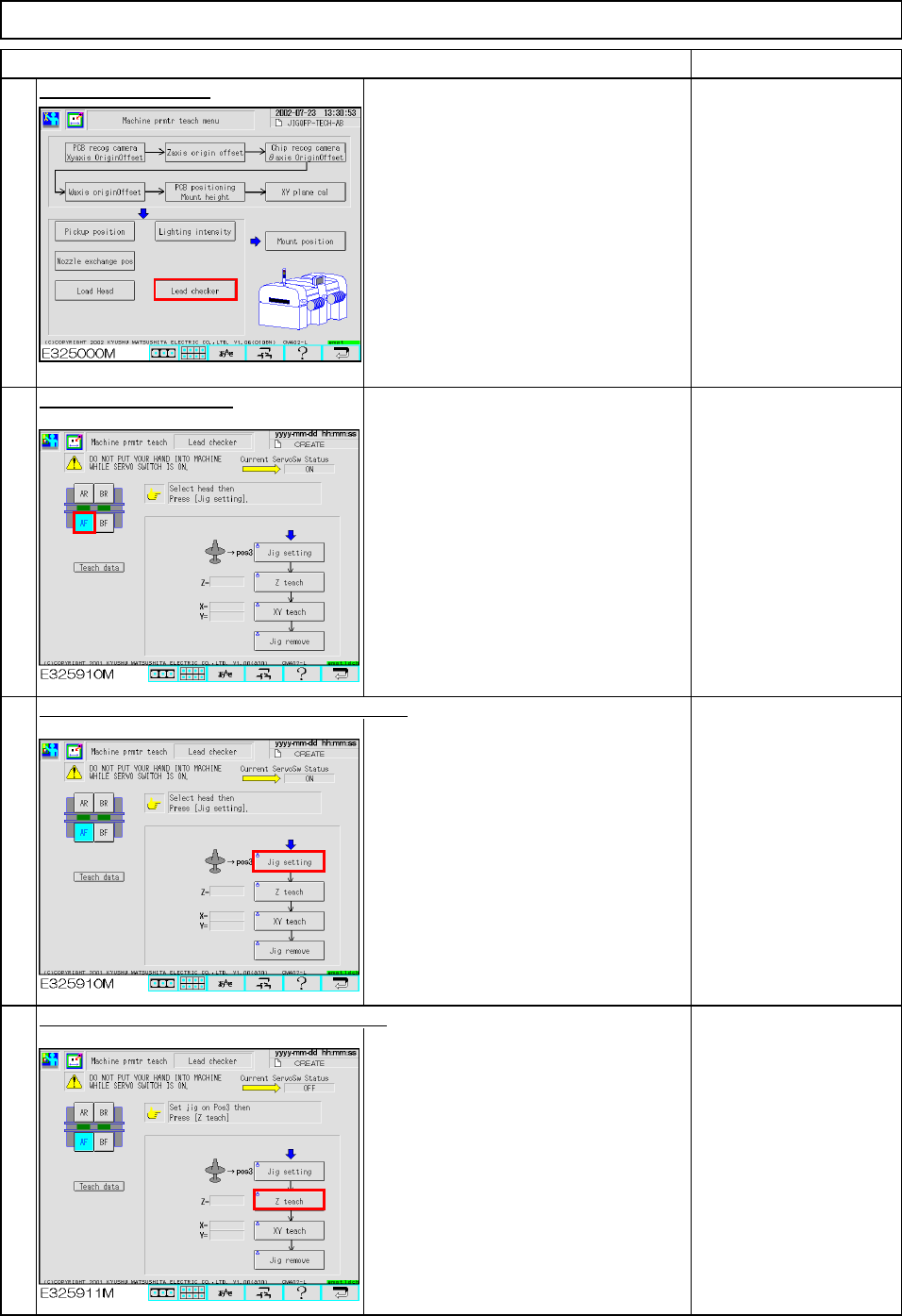 Maintenance Adjustment Light Transfer-Head Assembly(3-nozzles) Remarks Item Press [Unlock] and [XY teach] simultaneously. Starting from the point at which the Z teaching is finished, X and Y are measured automatically. P…