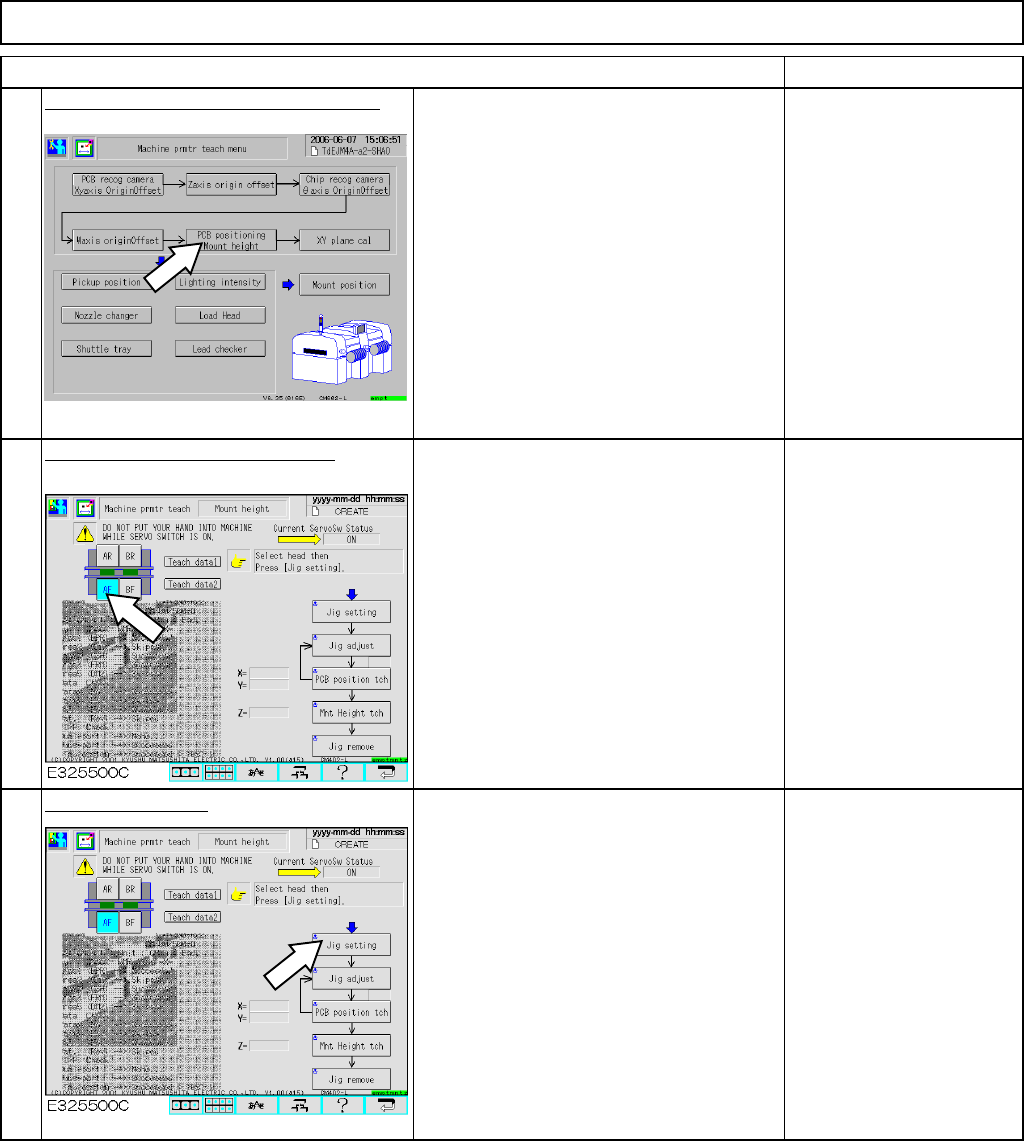 Machinery Part Replacement Remarks Press [PCB positioning Mount height]. Be sure to remove the support pins beforehand since the width of the conveyor is adjusted in this step. Select the stage to teach. (Front) Press [J…