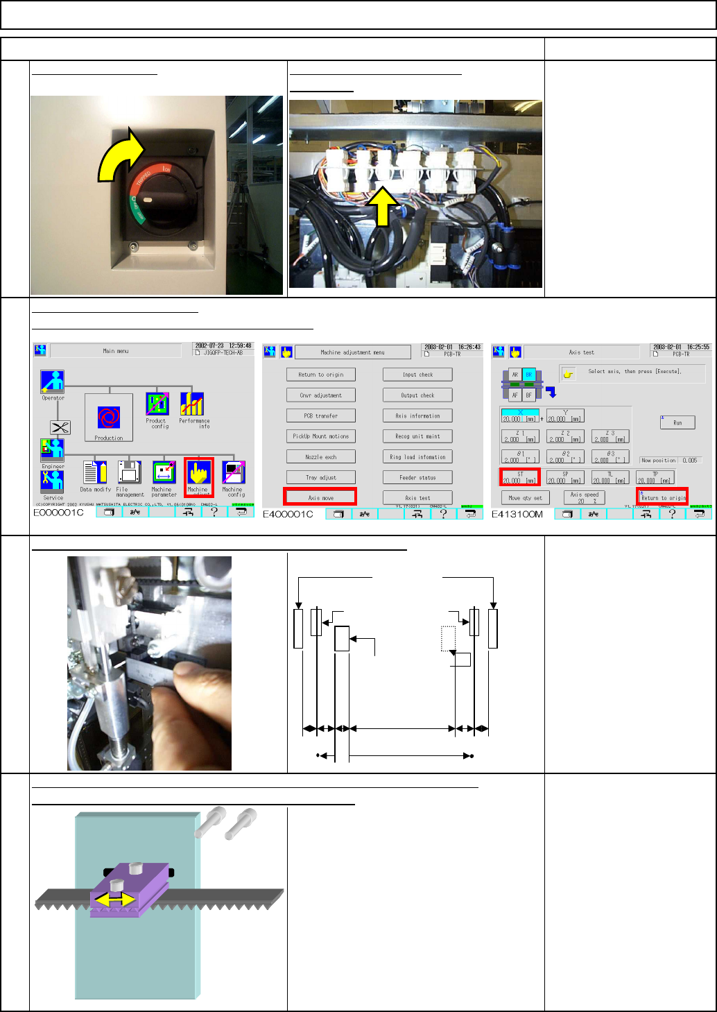 Adjustable distance: +/- 3 mm (The hole is 3-mm long.) Tray Shuttle Tray Item Remarks 13 Switch on the power. Fit the jig on the door switch connector. 15 Distance from Dog to Stopper: 9.5 ㎜ ±1 ㎜ 14 Measure the distance …