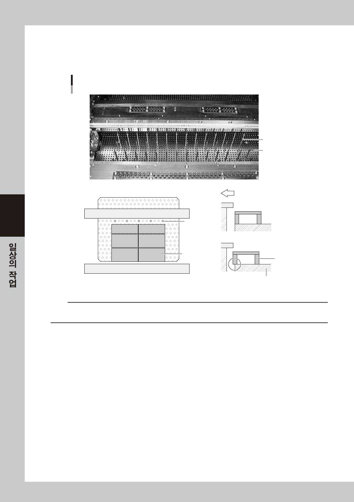 클리닝 유닛을 수동으로 이동시킬 때에는 , 핸들을 잡고 마스크 플레이트와의 틈새 ( 아래 그림의 화살표 위치 ) 에 손이 끼이지 않