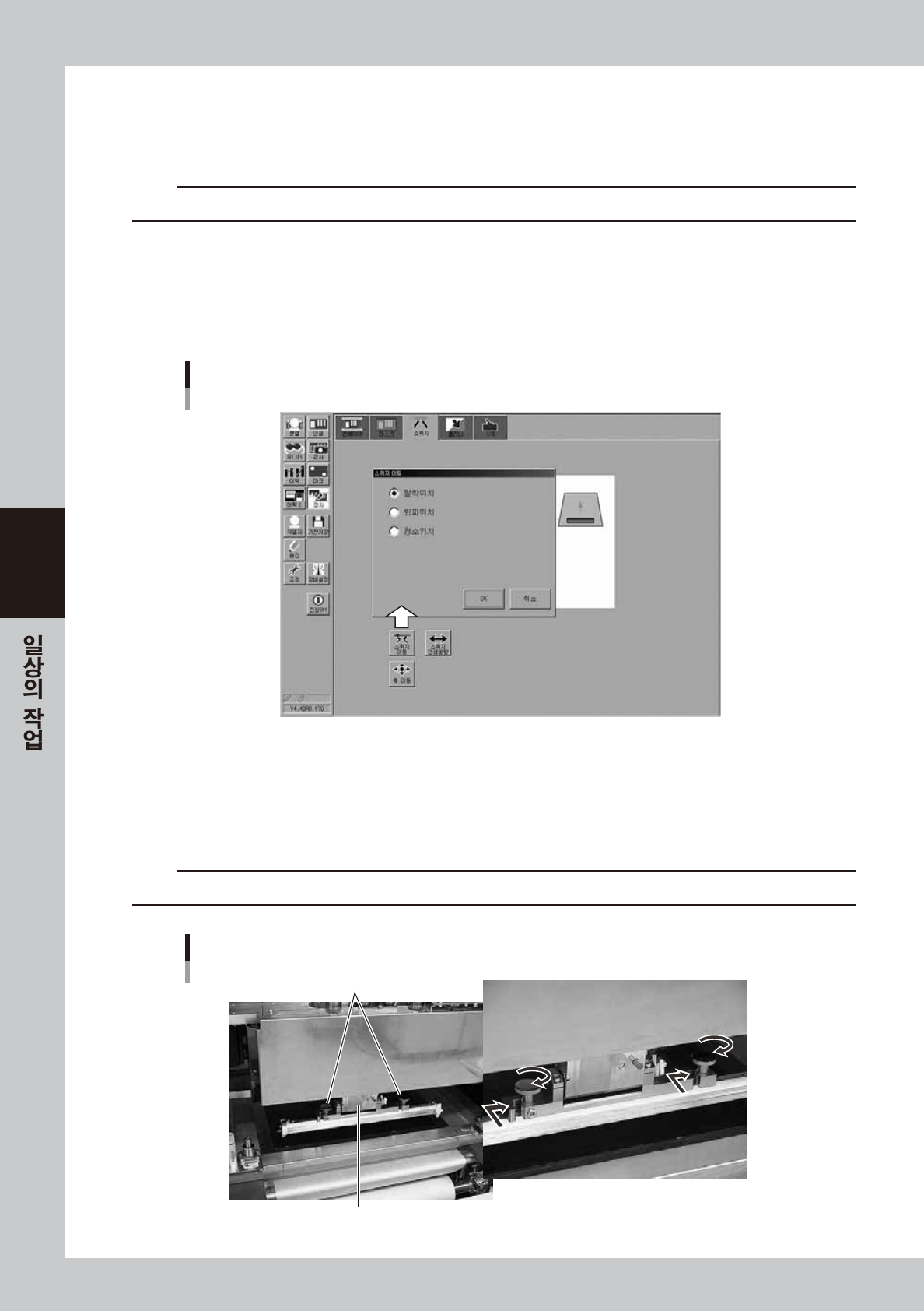 4-20 4 4 마 스 크를 클램 프 합 니다 . 마스크 를 인 쇄 테 이 블 의 좌측 안쪽에 대 이 게 한 상태 에 서 , 장비 우측 의 마스크 클램 프 스위 치를 오 른쪽 으로 돌려서 마스크 를 클램 프 해 주 십 시 오 . c 주의 마스크 클램프 유 니 트에 손 가락이 끼이 지 않도 록 주의 해 주십 시 오 . 5 스퀴지 헤 드를 「탈착위치」 로 이동시킵니다 . 1 . 상부 도 어 를 …