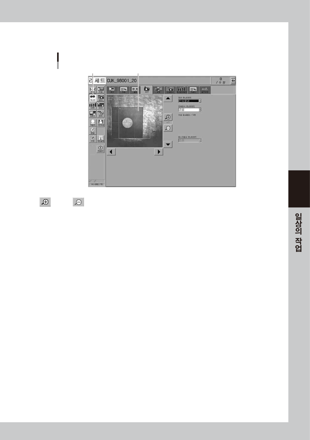 [+](확대)버튼을 누르면 인식화상을 1 에서 16 배까지 확대할 수 있습니다 . 또한