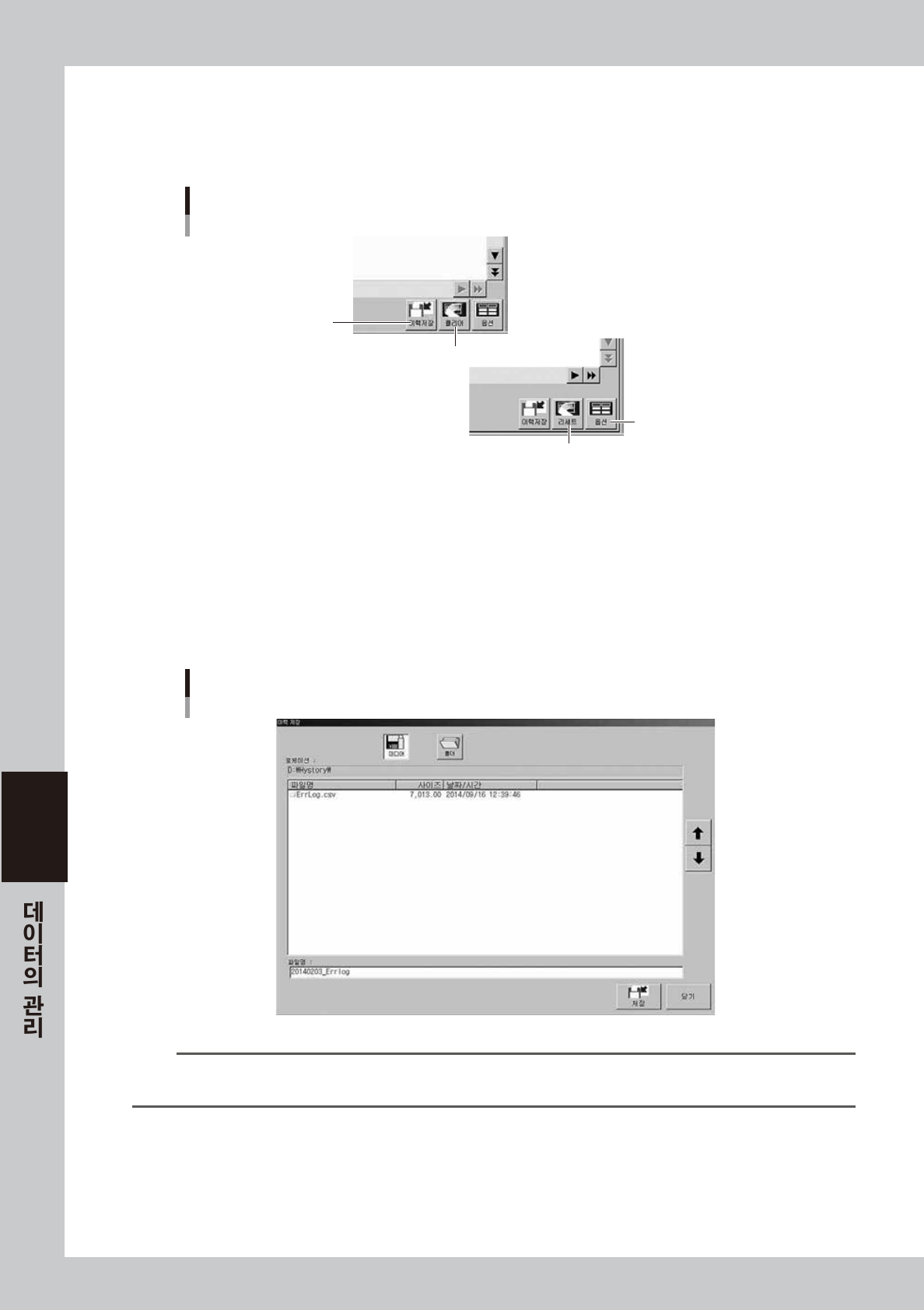 각 이력화면의 버튼을 조작해서 , 이력의 저장이나, 데이터의 제거 및 항목의 표시/ 비표시의 설정 등을 실행할