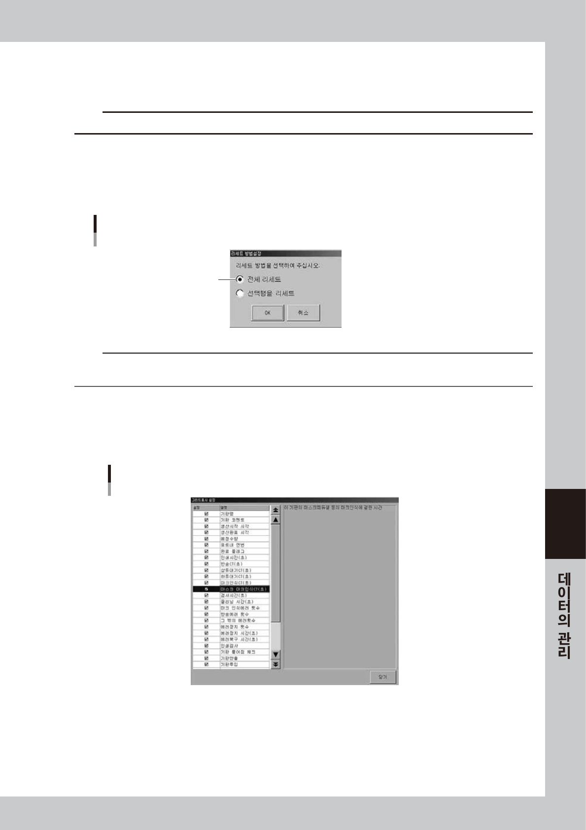 6-23 6 [ 클리어 ] 버 튼 ( 이력만 ) 현재 표시하 고 있 는 탭 의 모 든 이 력 데 이터 를 제 거 할 수 있습 니 다 . 단 , 데이 터 1 행 단위 로는 제 거 할 수 없습 니 다 . 제거 확인 대화창 이 표시 되 므로 , [ 예 ] 버튼 을 눌러 주십시 오 . c 주의 제거 한 데이 터 는 복구할 수 없 으 므로 , 주의 해 주십시 오 . [ 리 세 트 ] 버 튼 ( 이력 …