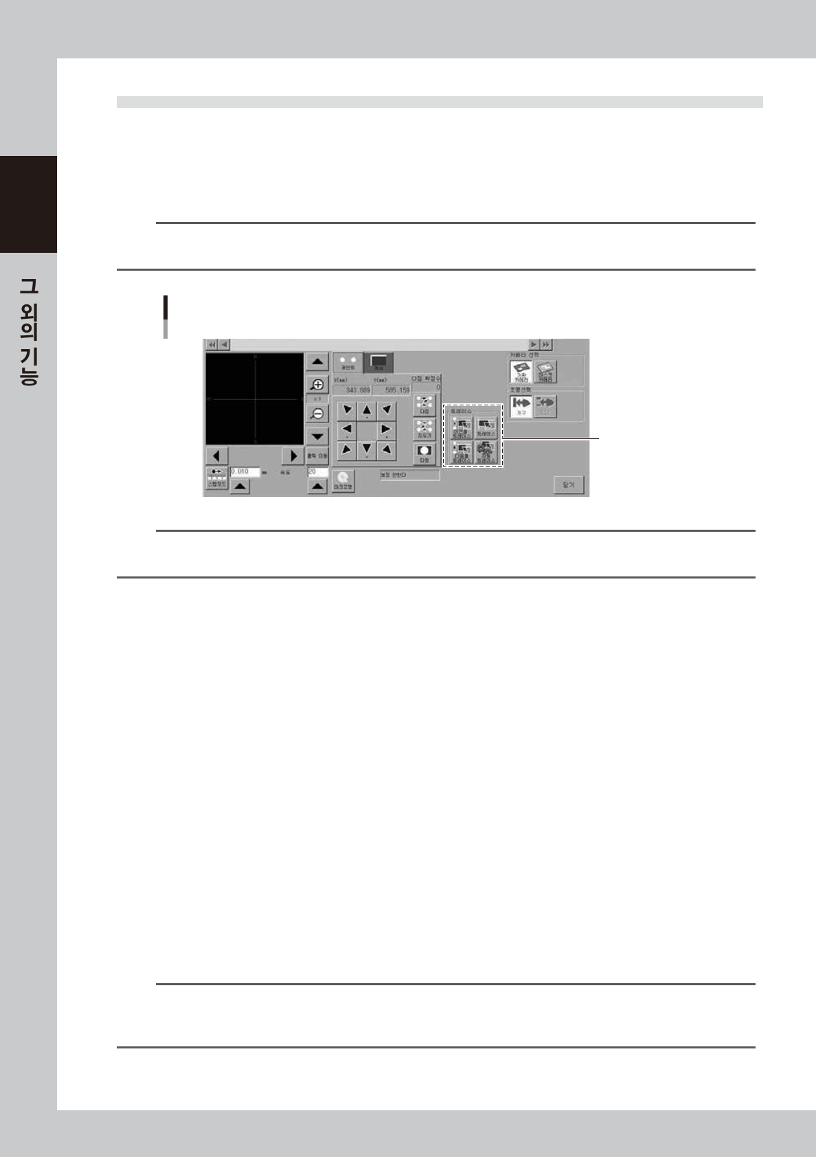 7-7 7 5 티칭 모 니터의 사 이즈를 조 정합니다 . 「커서 」탭 상의 버 튼을 사 용해 서 , 윈 도 우 사이 즈 를 조정 한 다음 , 대상물 전 체 를 윈 도 우 로 둘러 쌉니 다 . 각 버 튼 의 기 능은 아 래 와 같습니 다 . [ 좌 상 이동 ] 버튼 윈 도 우 좌 측 상단의 각을 정지 점 으로 해 서 화 살 표키로 윈 도 우를 확 대 • 축소 할 수 있 습니 다 . [ 우 하이…
