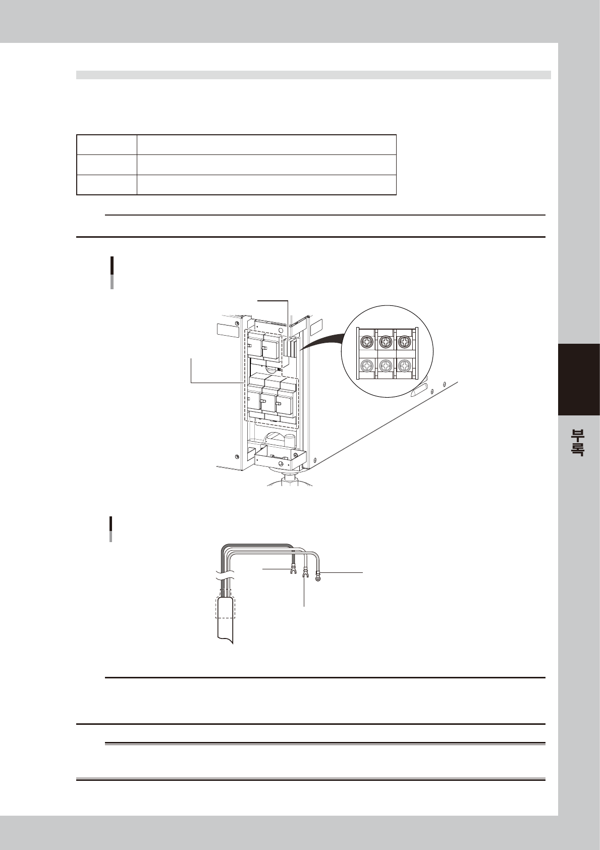 A-3 A 1 .2 전원접속 부 본 체 정 면 우측 하 단 패 널 을 열 면 전 원 접 속부 가 있 습 니 다 . 아 래 의 그 림 과 같 은 전 원 케 이 블을 사 용 해 서 , 메 인 브 레 이 커 의 일 차측 단 자 L 1 , L 2 , L 3 , PE 에 접 속 합 니 다 . ■ 전원사양 전원 단상 20 0 / 208 / 22 0 / 23 0V ± 20V 주파수 5 0/ 6 0 H…