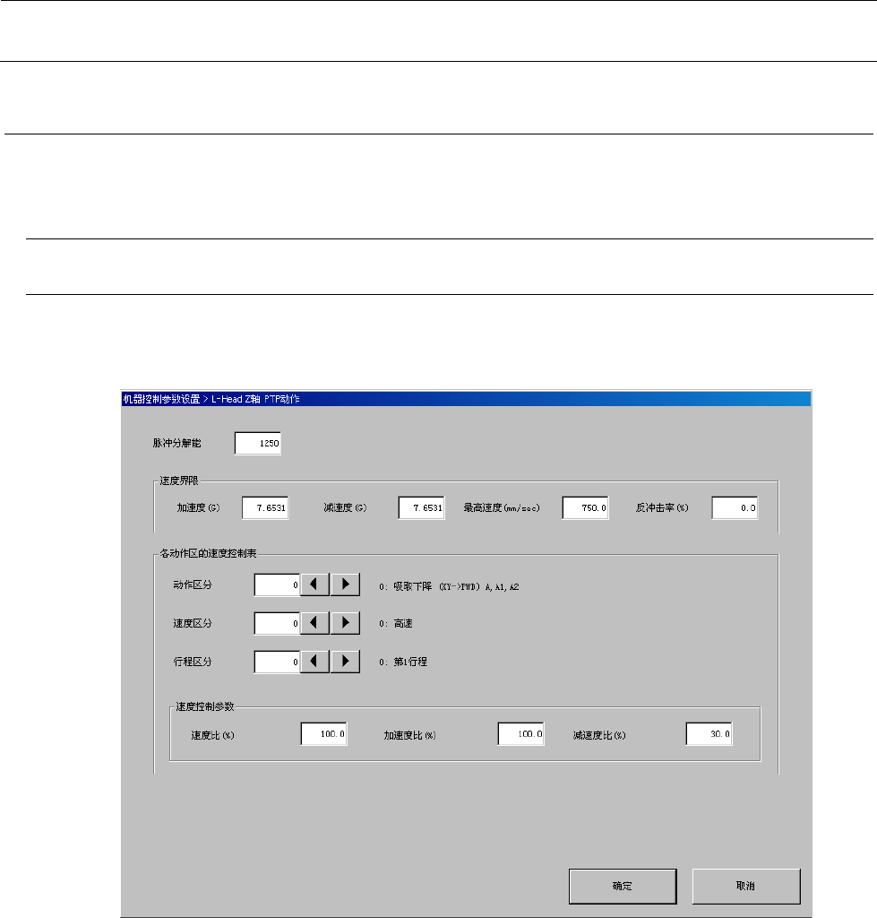 机器控制参数 2-1 2 详细操作 记述各画面的启动方法 及其内容。 2-1 Head 2-1-1 L- Head Z 轴 PTP 动作 如将 “ 动作区分 ” 、 “ 速度区分 ” 、 “ 行程区分 ” 设置为欲 编辑的索引,即可对所设定的区分中的速度 控制参数进行编辑。